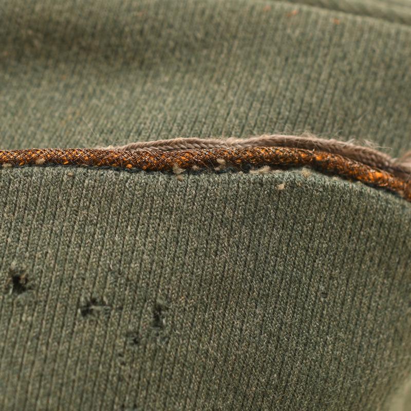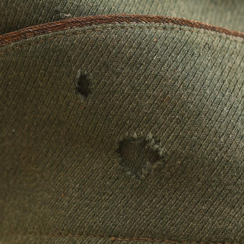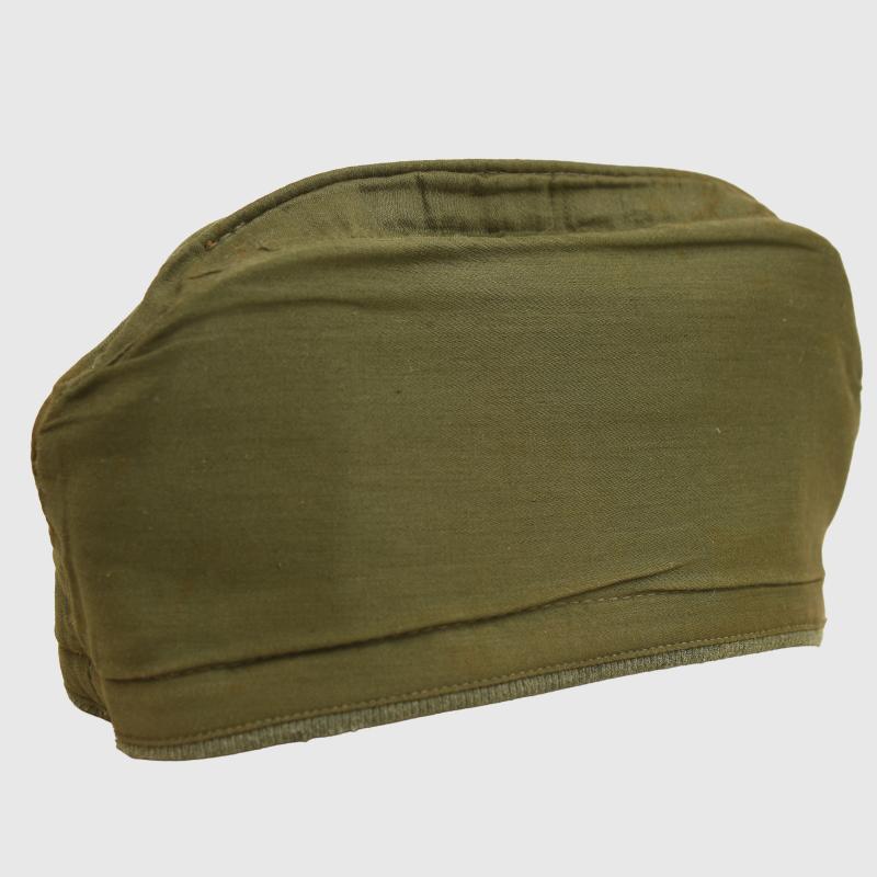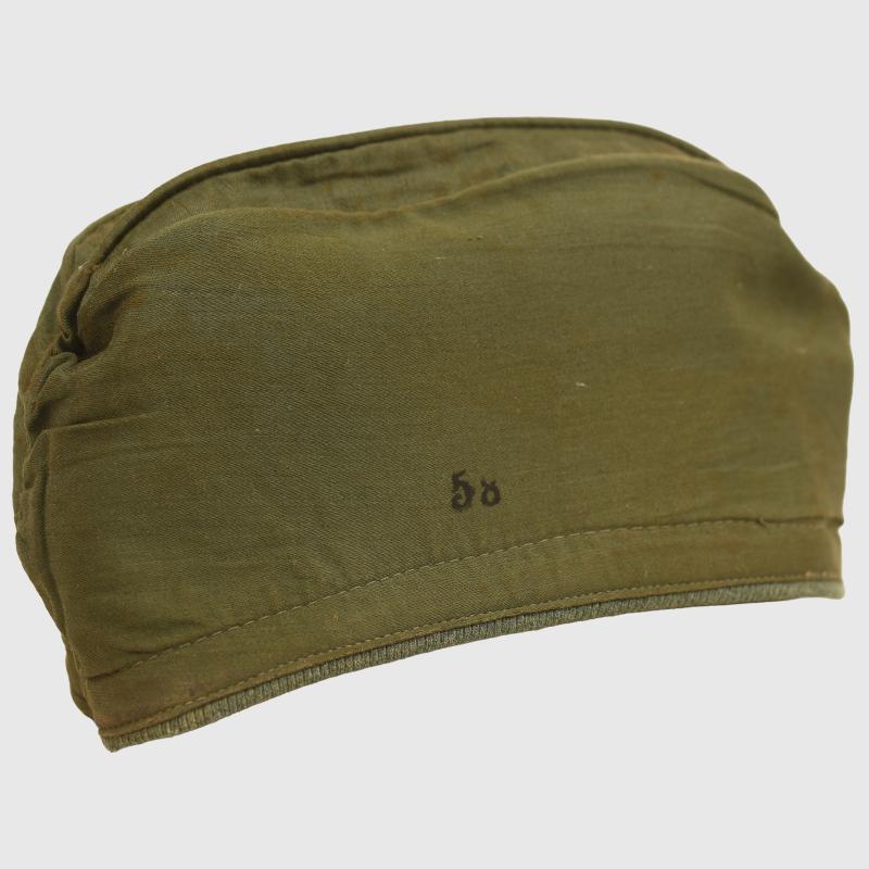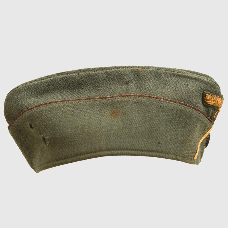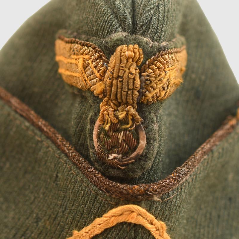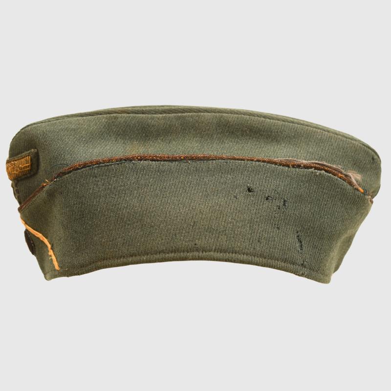 A size 58 overseas cap for a Coastal Artillery officer, constructed in the classic Coastal Artillery style of green. Two large moth holes on the left hand side, a sprinkling of smaller moth holes overall. The gGold waffenfarbe is shredded in places. Complete with its officers gold on Coastal Artillery green backing eagle, wire woven national cockade with yellow inverted V waffenfarbe. A very close matching green cotton lining, stamped size ‘58’.