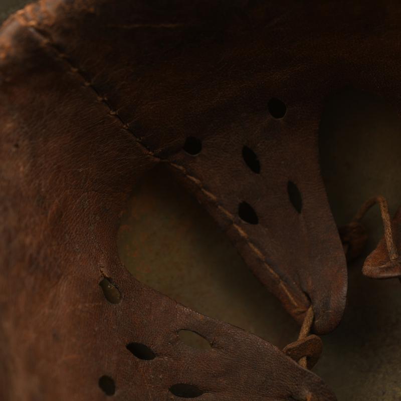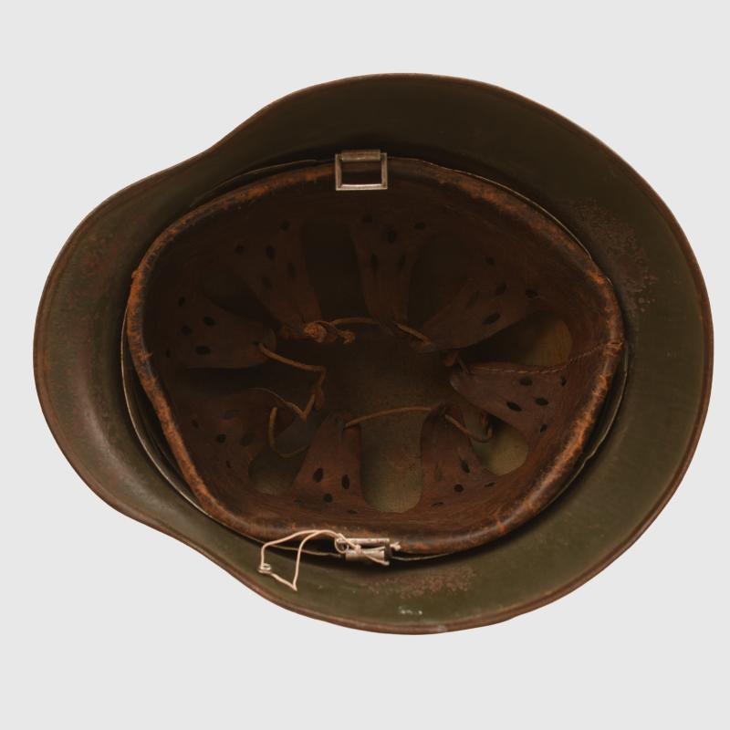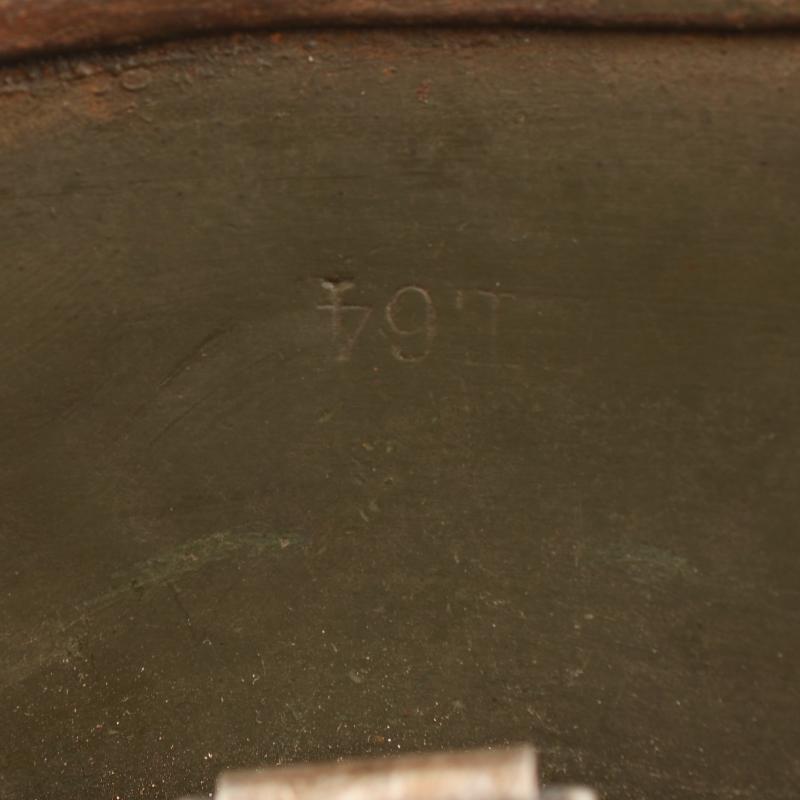 A good spray painted tropical helmet, some losses to the crown area otherwise generally complete. Original later apple green finish remaining to the interior shell. Marked ‘FE64’, batch numbers partially obscured, the remaining number is ‘23’ with M.35 interior liner, all complete, good deep colour, all tongues complete with its original drawstring, strap missing. To the rear of the helmet the original liner retaining rivet was missing and has been period replaced by a nut and bolt, the tropical paint is still attached to the nut and bolt.