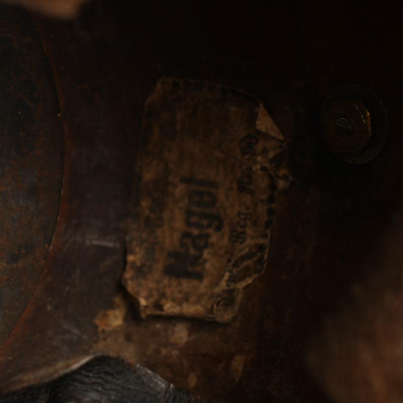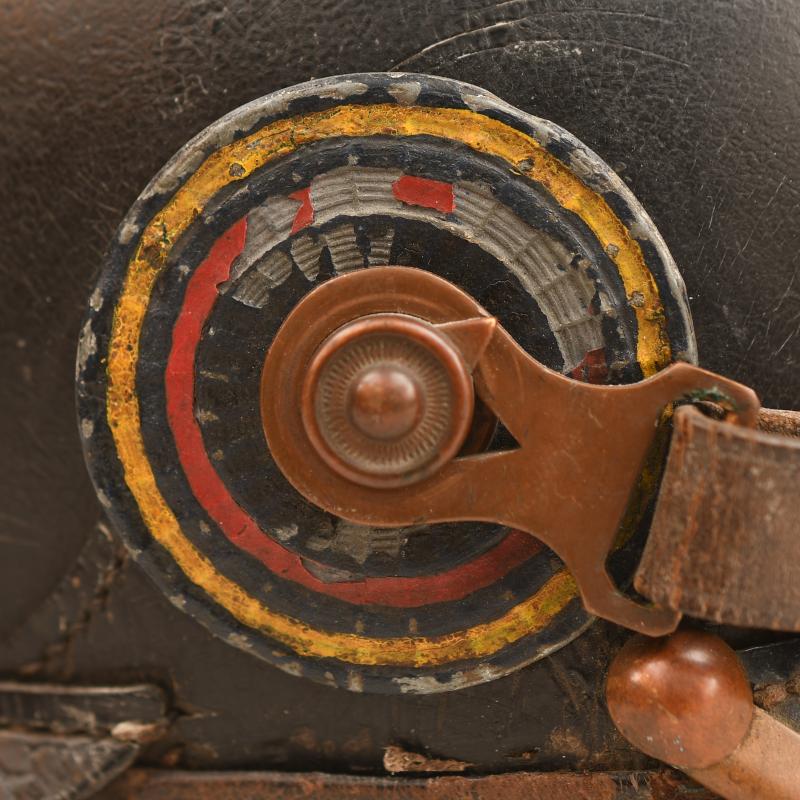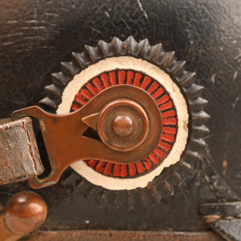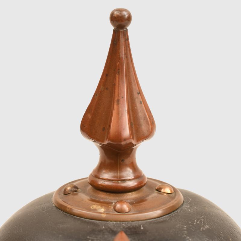 A good upper size all leather picklehaube, for a member of Mecklenburg Schwerin Regiment 90, the skull generally good with some slight creases, the front and back peaks minor congealing, securely attached to the main body, the stitching has not rotted, all of the fittings in subdued brass, minor indentation to the backstrap, complete with its correct national and Mecklenburg field cockades, original leather strap with matching buckles, to the interior the nine tongued leather liner all complete and supple, to the interior with the original owners name of Nagel and the designation of regiment 90, very faintly ink stamped to both halves of the rear peak which are very difficult to pick up on images is the regimental number 90 plus other difficult to read identifying numbers with a clear date of 1900 to the opposite side of the peak, one of the most difficult Duchys to obtain any items from being the Grand Duchy of Mecklenburg. More extensive, extra images can be seen on our new Premium website, type in regimentalsmilitaria.co.uk in to your web browser.