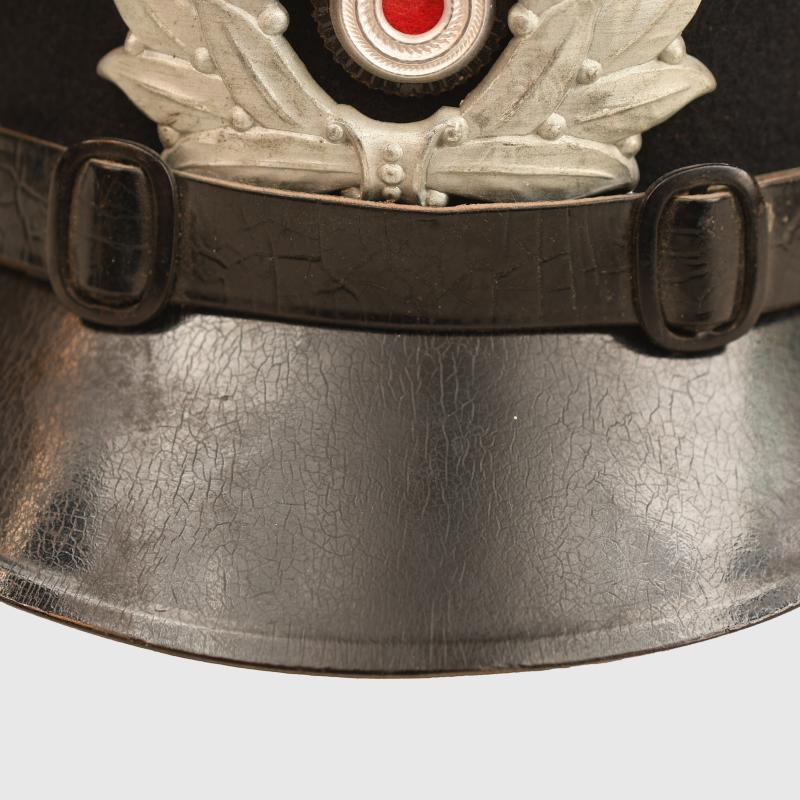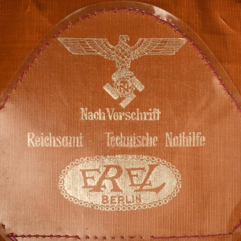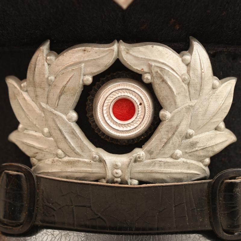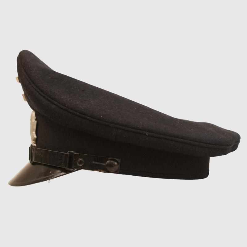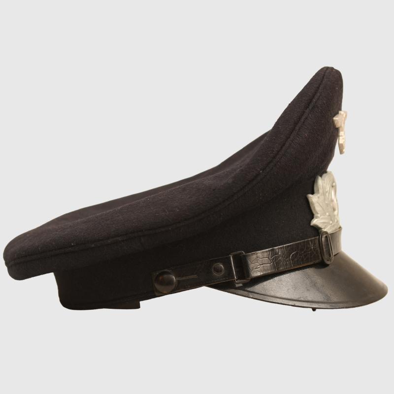 A very nice condition Erel produced visor cap for an enlisted mans in the Teno Organisation . All dark blue body with matching dark blue centre band, fitted with the stamped aluminium twinset of insignia of the Teno with the national cockade to the centre of the lower cockade. Standard black patent chinstrap with double oval buckles. The hat is of large proportions, possibly size 58. The interior is lined in the waterproof russet brown material, which has cracked in places. The sweatband is also of the darker tan ersatz imitation leather. The centre celluloid lozenge is all complete, below the lozenge it is beautifully silver blocked. Teno eagle and insignia with the ‘Erel’ trademark. A faint hand applied original owner’s name is also applied to the russet brown headlining. Good saddle shape, no damage of any type.