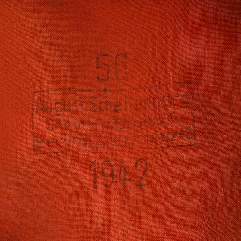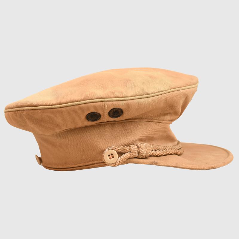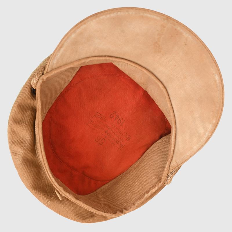A nice service worn example of the 1st pattern Hermann Meyer cap, these are distinguished by the fact of having in many cases tunic eagles fitted with a single tropical red, white and black cockade below. Stamped inside size ‘56’ by the Company of August Schellenberg and dated ‘1942’. The manufacturer Schellenberg were distinguished within the production companies of the Hermann Meyer cap as the only Company having a proud ridge running between the centre band and the upper part of the cap. Also fitted with its original officer style cap cords. The neck flap is missing. Some staining overall to the crown area. This example of cap shown on page 218 of AFRIKA KORPS 1941-42, VOLUME 2.