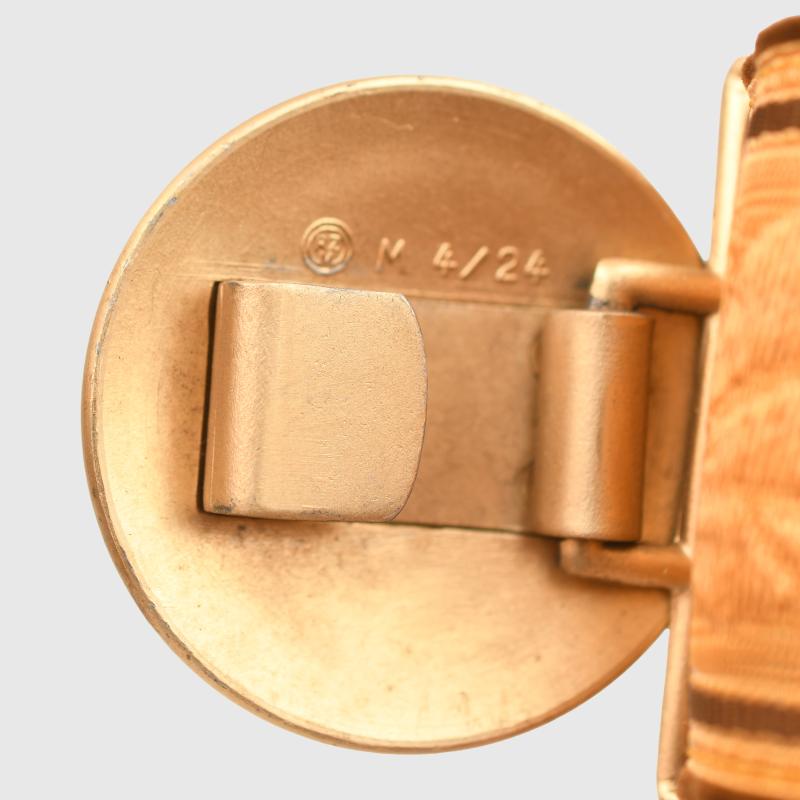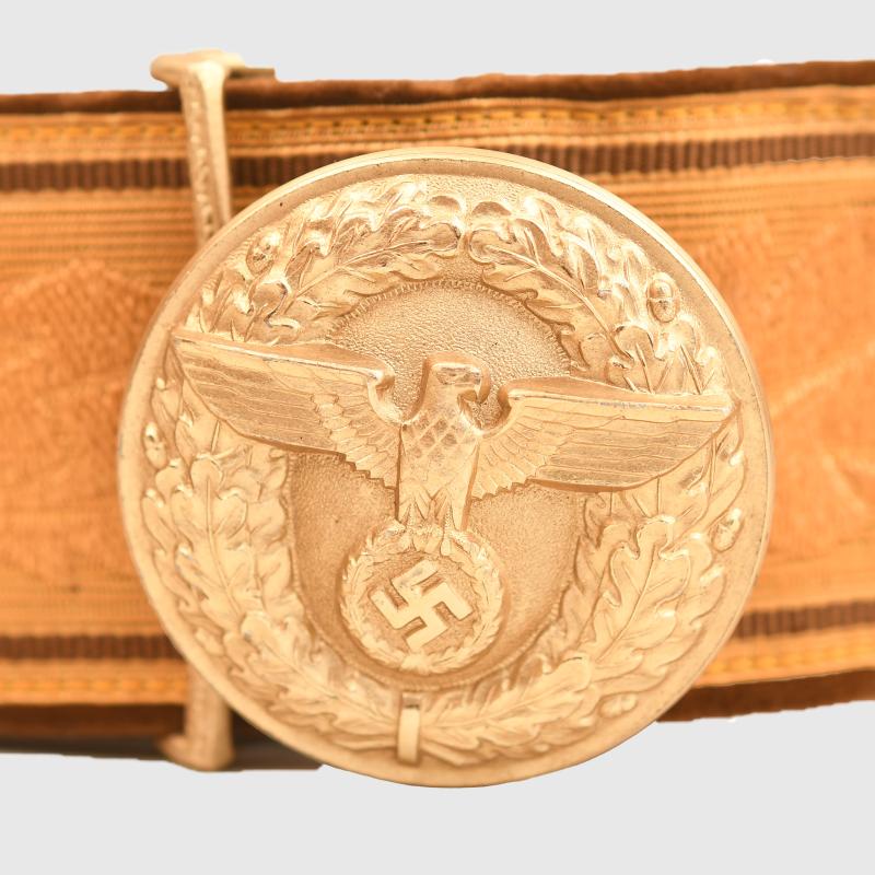One of the most attractive of all the parade belts of the Third Reich period is the Political Leaders. Beautiful gold leaf exterior brocade laid over political brown velvet backing, complete with its slightly smaller size parade buckle, which retains every bit of its original gilt. Maker marked on the rear of the buckle ‘RZM 4/24. Both the brocade sliders are present on the belt. Complete with its paper RZM ticket applied to the leather adjuster on the reverse side. The leather adjuster itself is marked size 95.