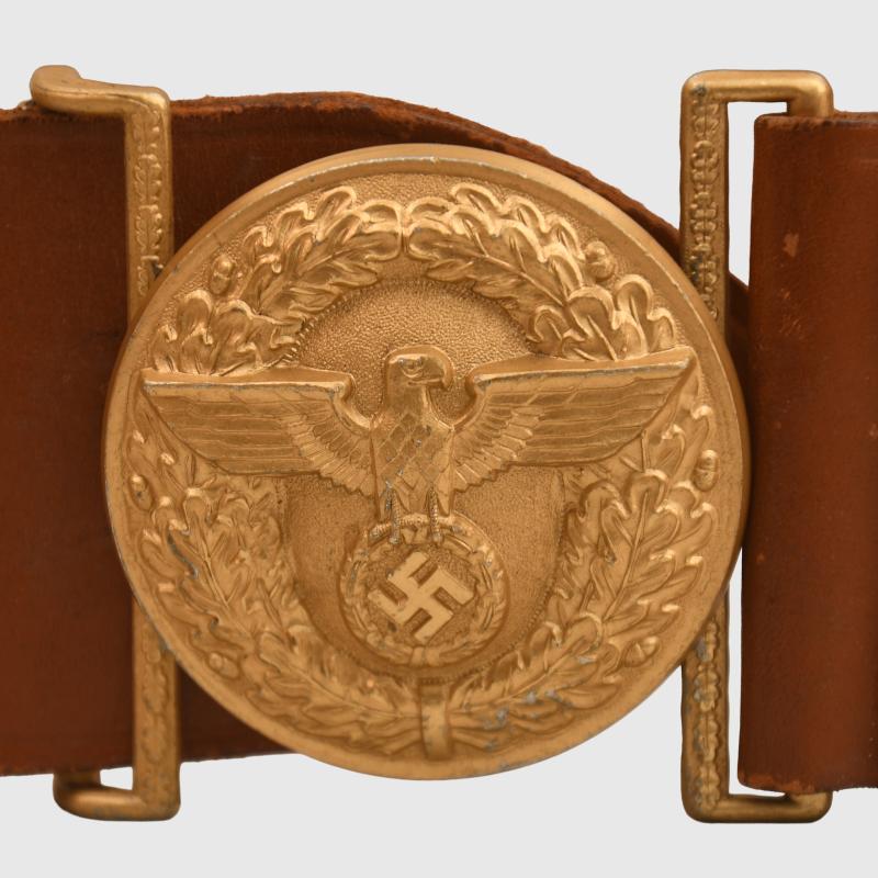 A fabulous condition wide brown service belt as worn with the political uniform. The adjuster tab is stamped size 95. The standard larger size all gilt belt buckle marked ‘RZM M4/24’ with all its gilt. The belt has both of its leather runners present.