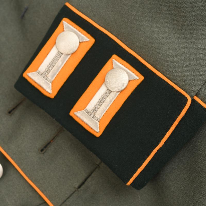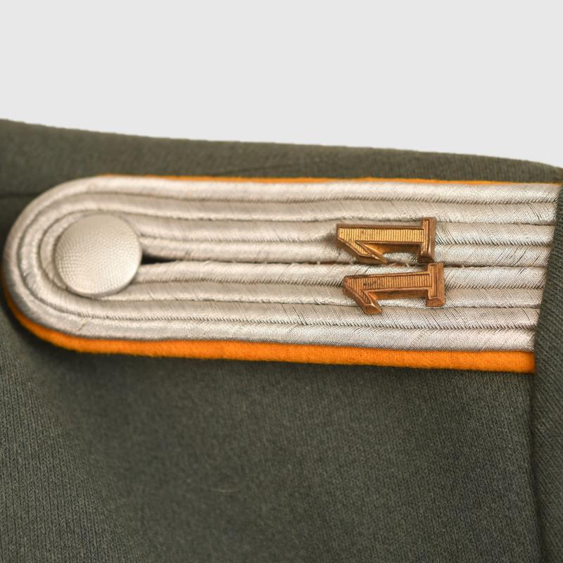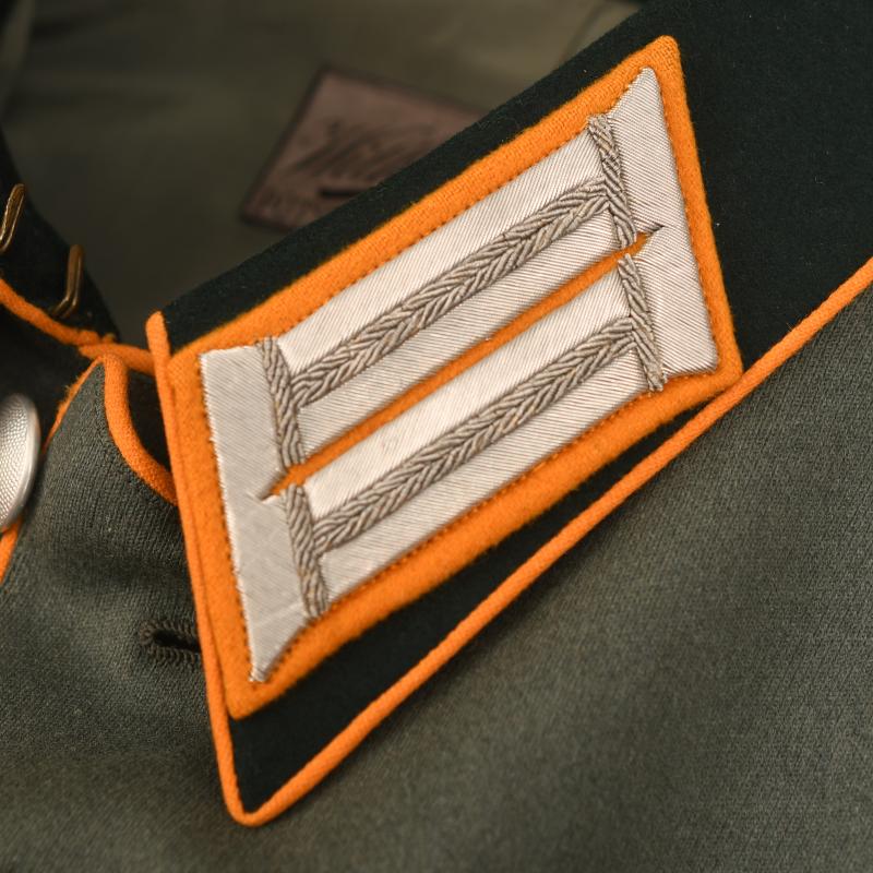 A magnificent condition upper medium size parade tunic for a Leutnant in the 11th Cavalry Regiment. The material is of the finest grey quality contrasting beautifully with its dark green collar and yellow waffenfarbe overall. Standard army officers shoulder boards to the rank of Leutnant with yellow based cloth with the number ‘11’ in gilt attached. Yellow based heavily wire woven collar patches, yellow piped collar and front skirt also yellow piped rear skirt and cuffs to the tunic. A very high quality officers breast eagle attached with a set of adjutants aiguillettes. Silk tailors label of ‘Wilhelm Neufaus Potsdam’ attached to the inner upper section of its lining. To the interior pocket the original matching tailor’s label in canvas with the name of the officer, which is then the rank of ‘Oberfaheriach Diesenthal’ with the date of ‘April 1937’. Two loops for a medium size medal ribbon bar fitted and one set of loops below for another award. The tunic is completely free of any moth damage or stains. More extensive, extra images can be seen on our new Premium website, type in regimentalsmilitaria.co.uk in to your web browser.
