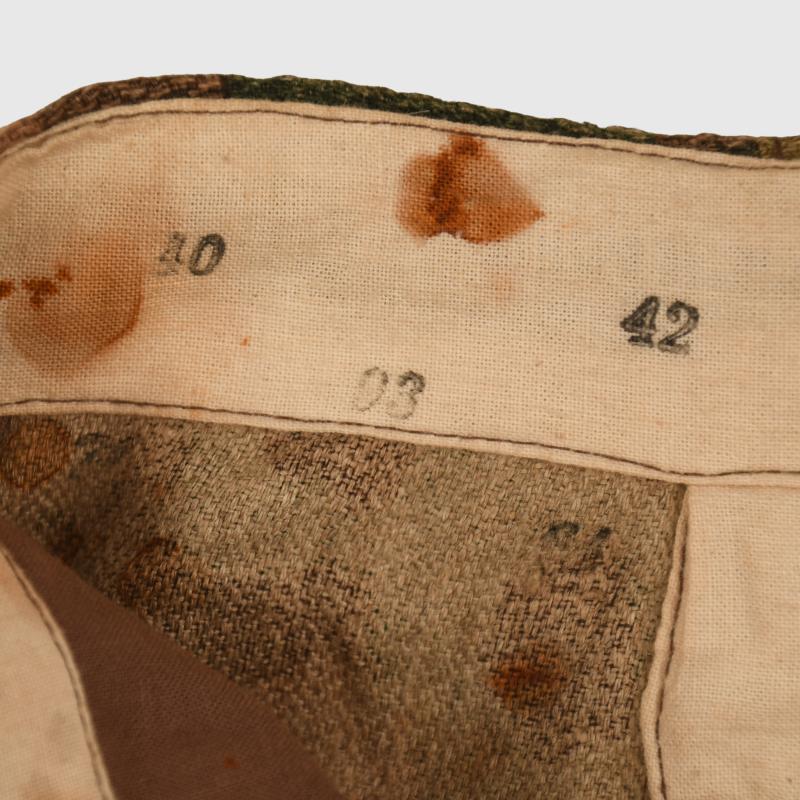 A mint stored pair of the 44 pattern camouflage trousers, part of the two-piece suit. Good bright colours to the camouflage finish and pattern. No moth damage anywhere on the trousers. Complete with its belt loops. All buttons complete including the pocket closure buttons. The adjustment belts on each side of the waist are complete, with rust to the buckles. Light rust stains to the interior white cotton lining. Faint traces of the original size stampings still visible to the waist band. Standard reinforced double thickness seat area. Cloth tabs for securing the base of the trousers around the foot of the wearer is all intact. An excellent set.