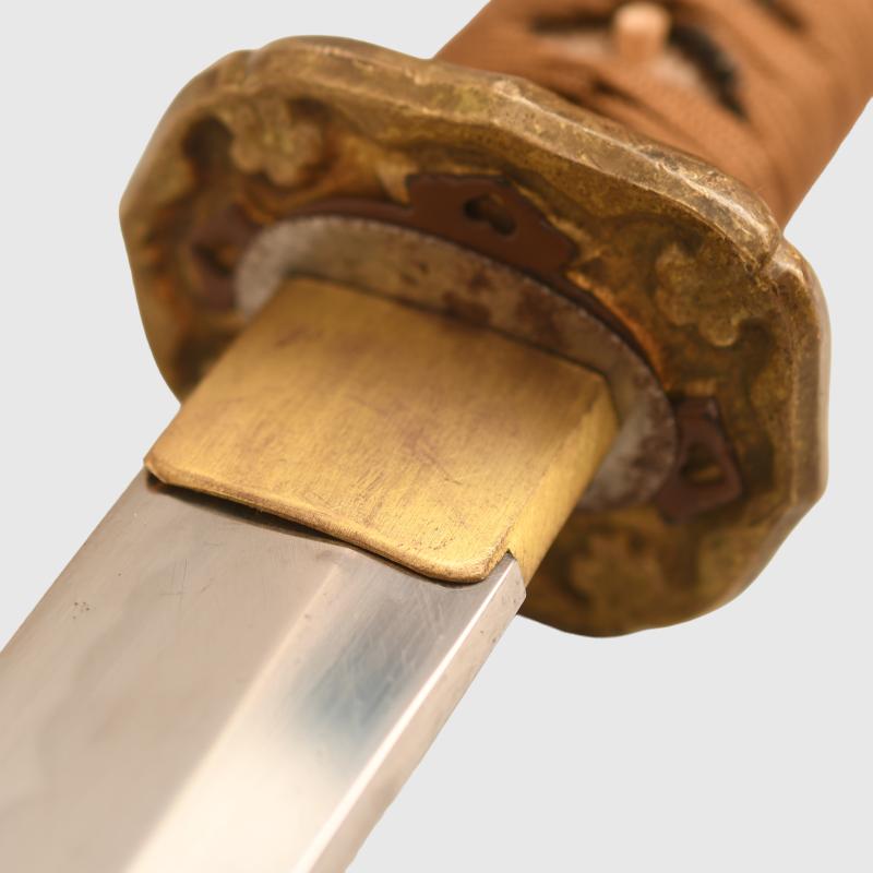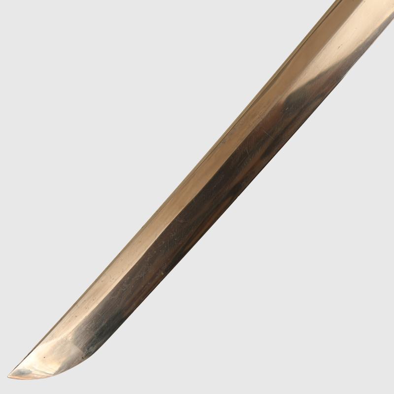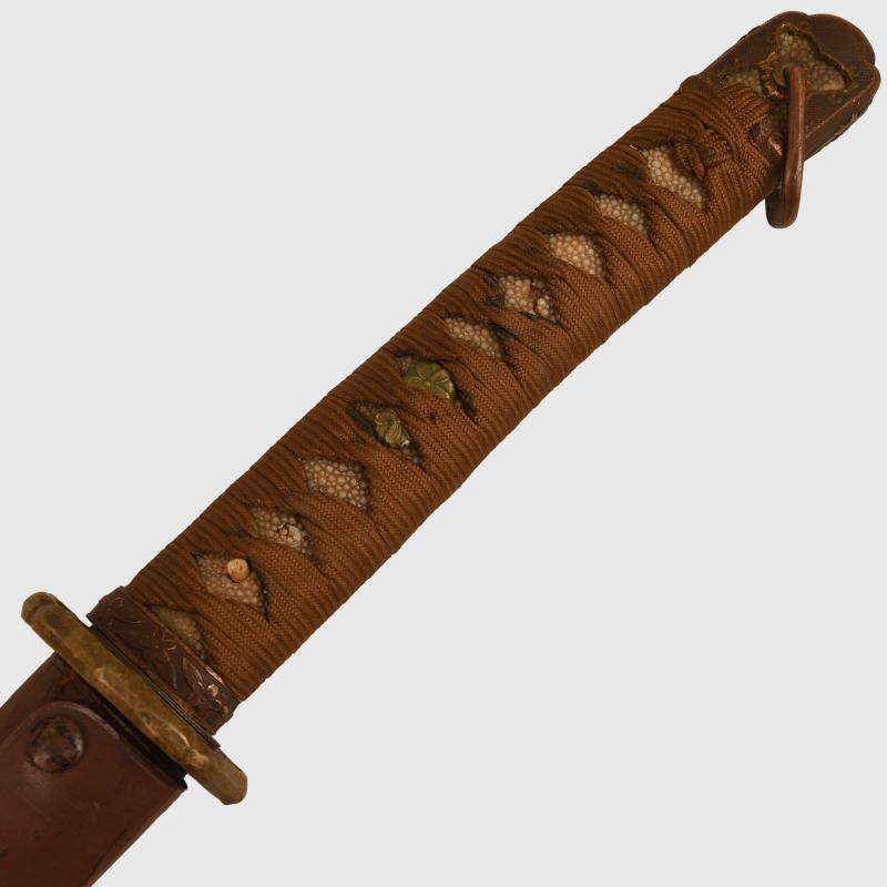 A very nice Japanese officers sword having a 26 ½ inch blade with a very attractive wavy hamon. There are no flaws, scratches or impediments of any type to the blade. The tang of the blade is signed with 7 characters, plus the Showa stamp. The hilt has very nice and attractive grip binding with undamaged ray skin below. Standard military fittings overall with a pierced Tsuba (cross guard). All fitted into its wood scabbard having its leather combat cover, the cover itself has a few abrasions and discoloration but generally the leather is good, the stitching has not rotted and is a typical combat officers sword. More extensive, extra images can be seen on our new Premium website, type in regimentalsmilitaria.co.uk in to your web browser. The sale of Knives, other Edged Weapons and Firearms are restricted to those aged over 18. Verification of age is required before purchase is concluded, this will include providing a scan of photo ID including your address and in some cases may require video verification by FaceTime or WhatsApp video, at Regimentals discretion, until formal laws on this requirement are enforced in the UK.
