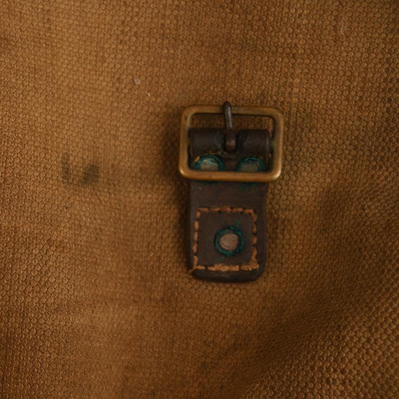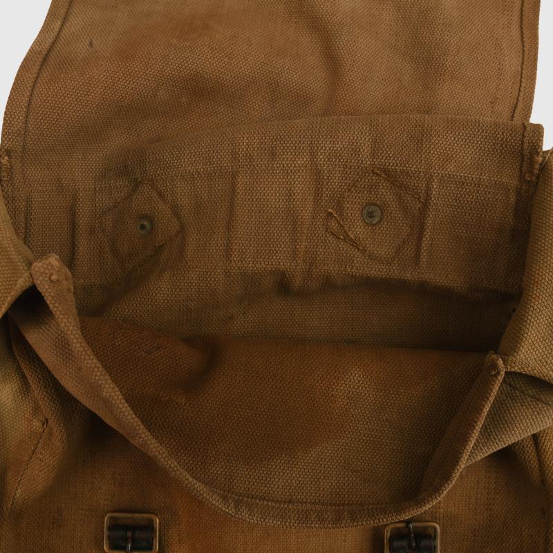 This pack has seen service use and is stained overall, all of its 1914 leather buckles and attachments are complete including one of the long straps, there is a hole to the webbing close to the lower left hand buckle as the pack is viewed, faint traces of original owners name or unit on the large back panel, stitch marks around the two other upper leather buckles indicate this has been modified at some stage.