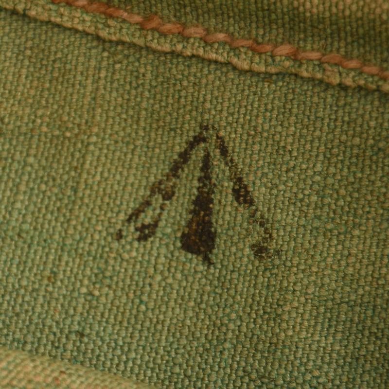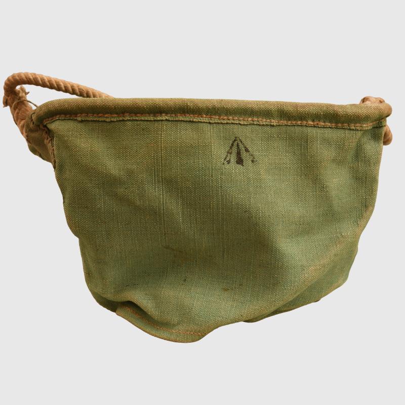 A clean example of the canvas water bucket with its rope carrying handle, broad arrow marked.
