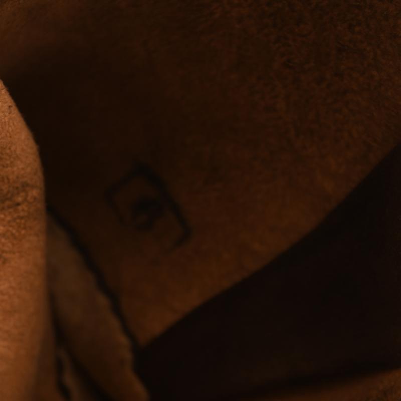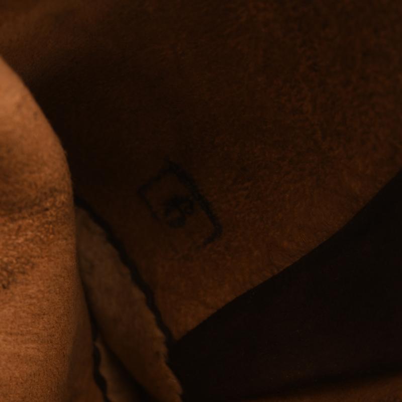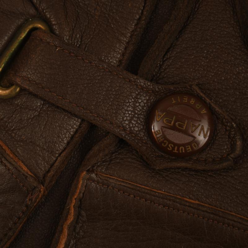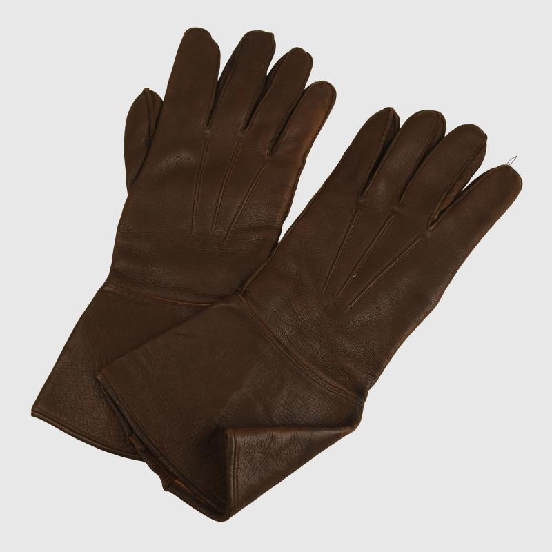 All four fingers and one thumb, complete with adjuster strap. Marked size ‘9’ to the interior. Good brown leather.
