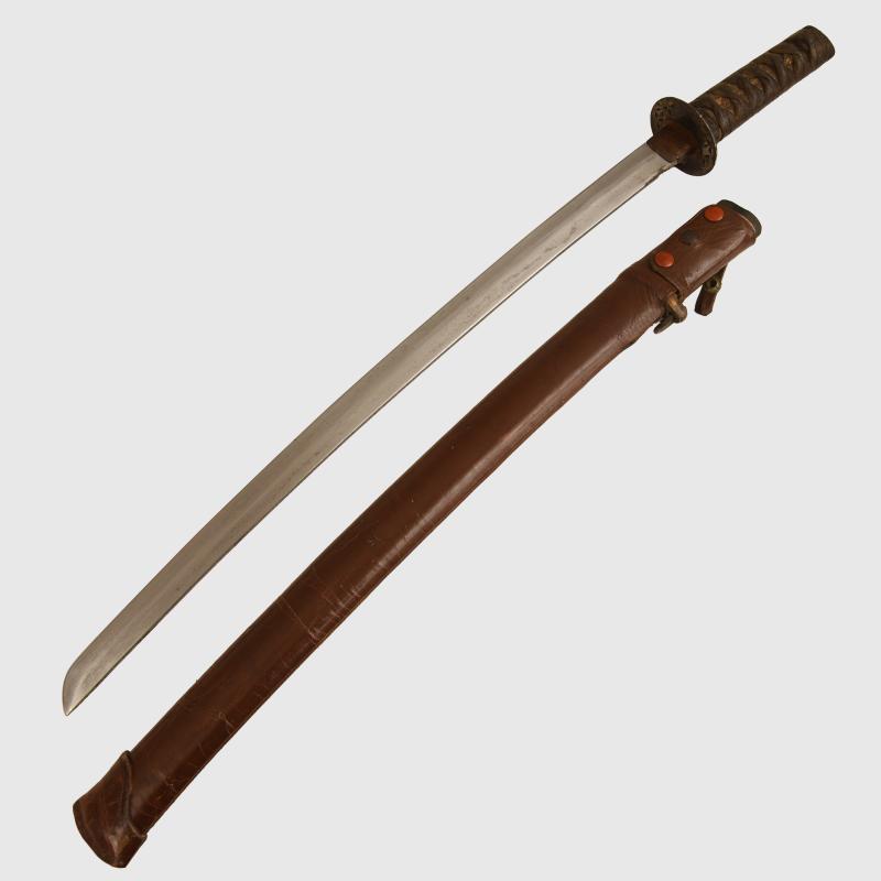A Japanese Wakazashi having a 56 cm blade. Nice condition, one minor crease at the lower end of the blade, with its Wakazashi hilt fittings, the hilt itself being 14cm long. Some gold still visible to the fittings on the lower grip and underneath the cloth binding to the hilt, known as the menuki. Some piercing to the iron tsuba, which in itself is circular in form. All fitted into its wooden scabbard, which has its own very nice condition combat leather cover. The three press studs that hold the cover closed still operational. The long leather tab, which passes through a pre cut form in the tsuba that holds the hilt into the scabbard is still intact and working correctly. These shortened swords in combat covers were taken with the pilots into the aeroplanes before there Kamikaze attacks. The sale of Knives, other Edged Weapons and Firearms are restricted to those aged over 18. Verification of age is required before purchase is concluded, this will include providing a scan of photo ID including your address and in some cases may require video verification by FaceTime or WhatsApp video, at Regimentals discretion, until formal laws on this requirement are enforced in the UK.