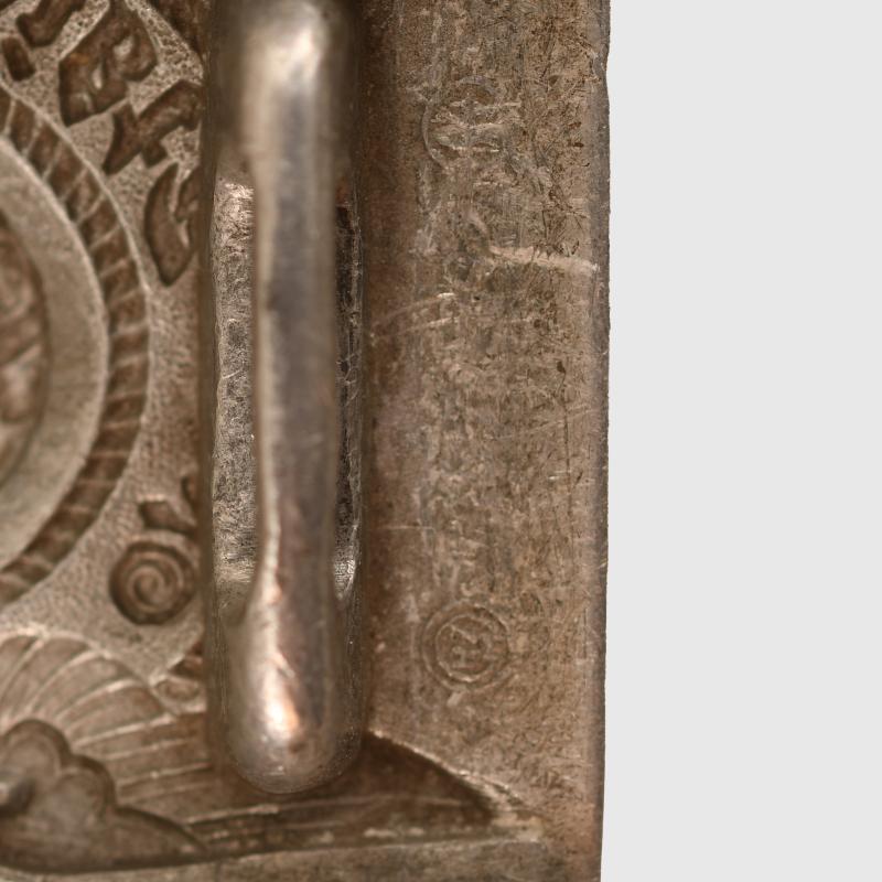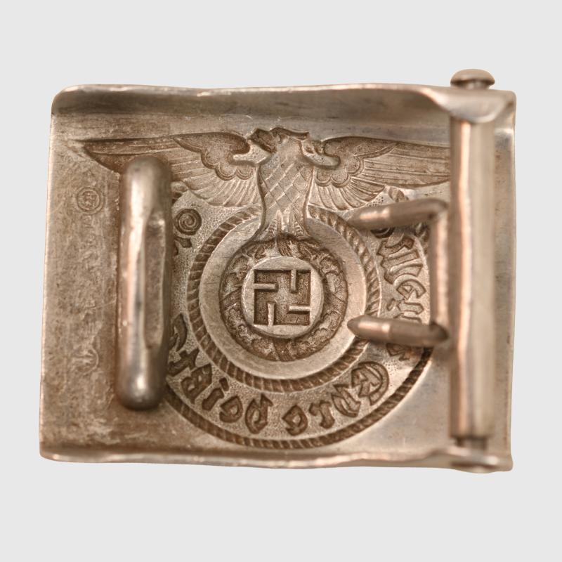 A good service worn example of the die struck aluminium buckle, very faintly marked ‘RZM155/39SS’ on the reverse side, these markings can only be seen with an eyeglass, to the wreath surrounding the central swastika.