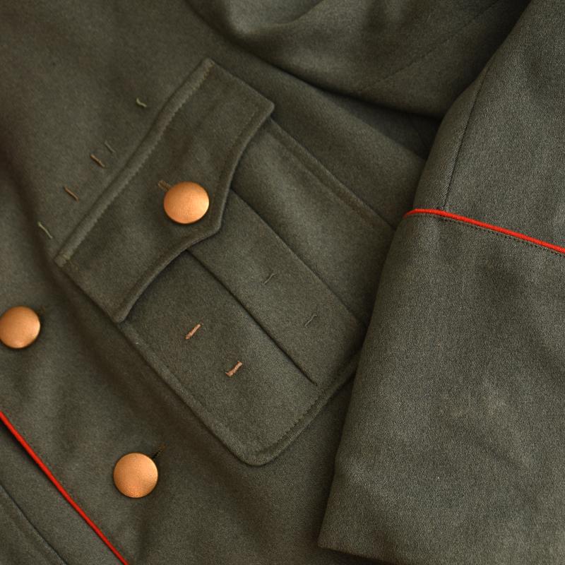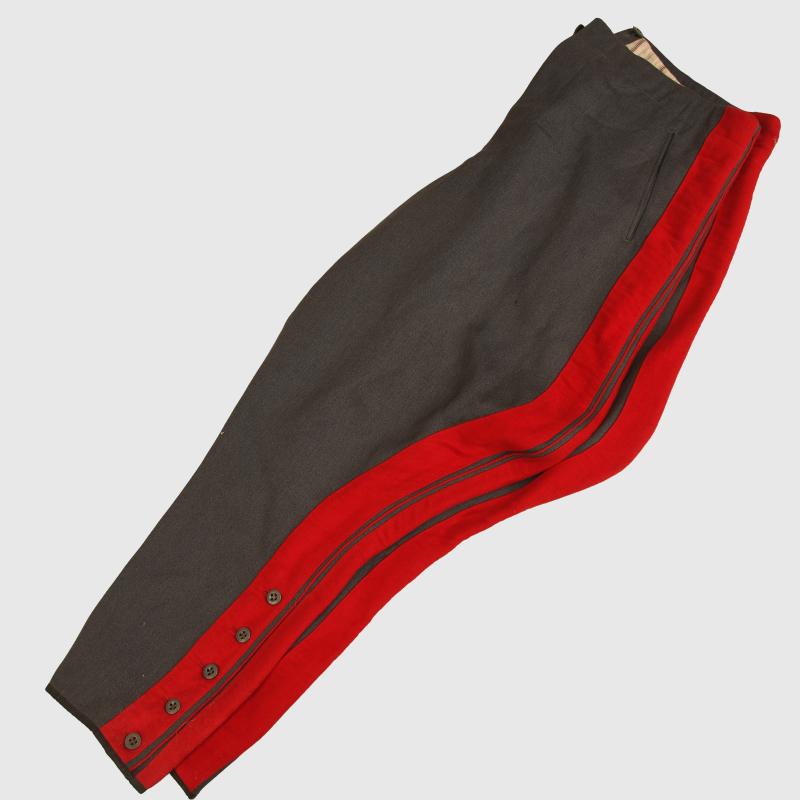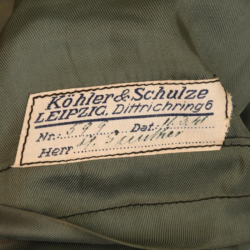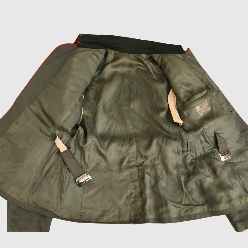 A fabulous General’s uniform being the ex property of Major General Gunther Angern, born March 1893 died 2nd February 1943, a German General in the army during WWII who commanded the 16th Panzer Division during the battle of Stalingrad. He was also a recipient of the Knights Cross to the Iron Cross. He initially joined the Imperial German Army as a junior officer and fought throughout WWI. In the interwar period he joined the Third Reich Wehrmacht and by 1938 was Commander of the 3rd Rifle Brigade. In August 1940, now a Colonel, he was awarded the Knights Cross to the Iron Cross whilst commanding the Brigade in France. He saw service in Russia from August 1941, wounded in Russia and returned to duty as a now General Major in September 1942 and took command of the 16th Panzer Division operating to the north of the city of Stalingrad. Angern remained in Stalingard throughout the siege and was promoted to General Lieutenant in January 1943. He stayed with the army after failing to escape the encirclement by the Russian and he committed suicide on the 2nd February 1943. Excellent condition M.36 style piped uniform with the front skirt of the tunic piped in red, the upper cuffs piped in red, the dark green collar also piped in red. Very high quality bullion wire collar patches fitted with matching General Majors bullion wire gold and silver lace with red underlay shoulder boards. Fitted to the upper left breast is a matching gold bullion wire on green breast eagle. All of the buttons match in gold. To the upper right breast there are five loops for a medium size medal ribbon bar with loops below for two awards. To the interior a silk woven Leipzig tailor’s label, to the interior of the pocket the canvas label of the same tailor with the name ‘Gunther’ to the interior number ‘599’ dated ‘11/3/41’. Also to the interior a sword or dagger hanger clip with a hole tailored through the lower left hand pocket. A pair of grey Generals breeches with the correct pattern of red stripes to each seam. The whole uniform is totally free of any moth damage or staining.