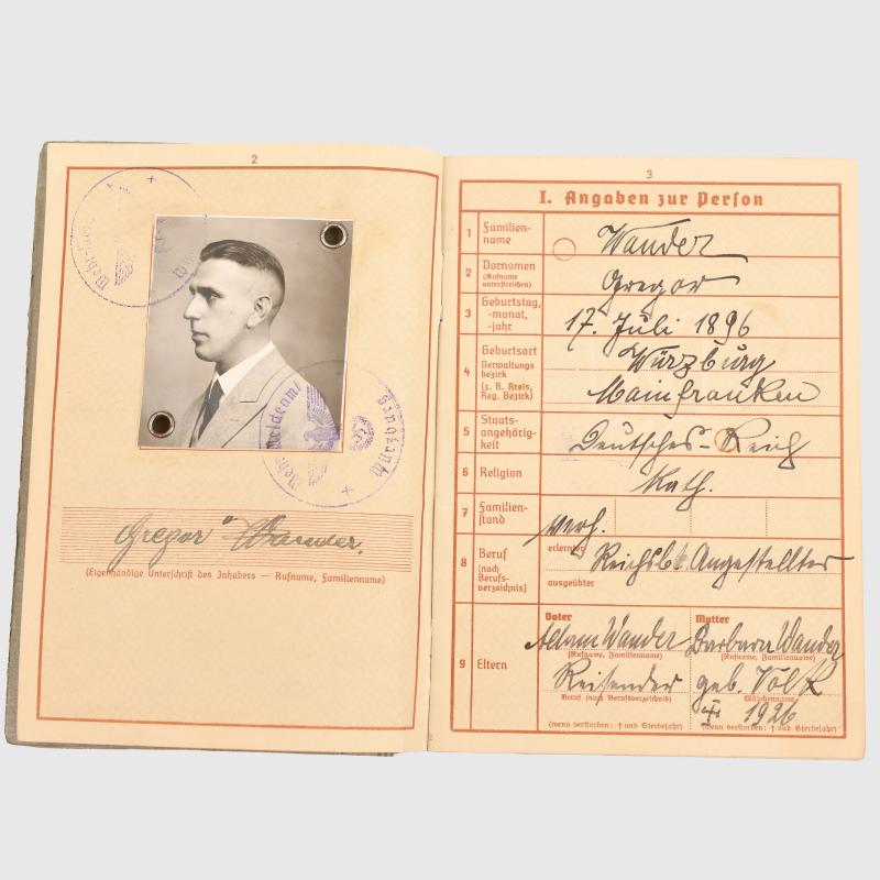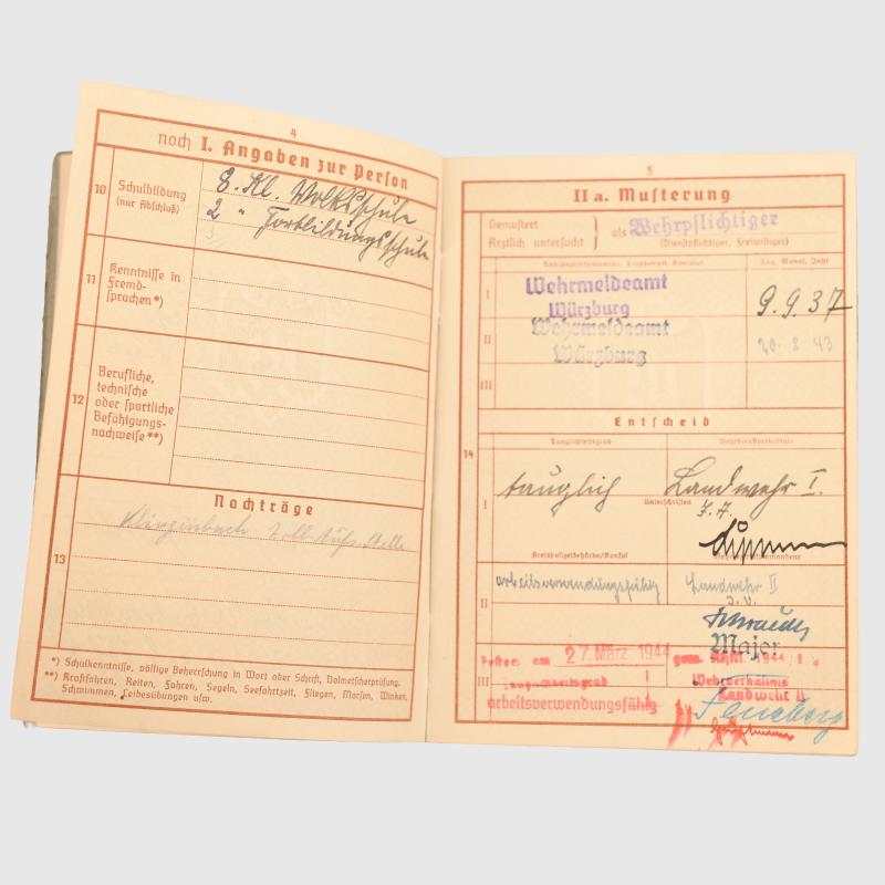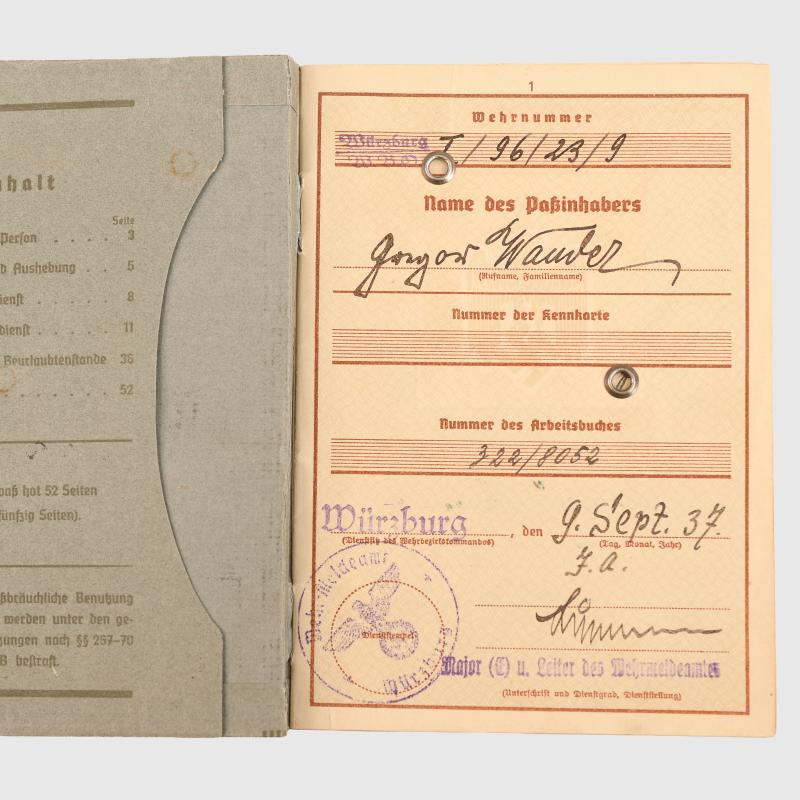 A clean virtually unused condition example of the soldiers Wherpass, this document was generally held at area headquarters, the soldier himself carried the document known as the Soldbuch. Photograph in civil dress of a man born in 1896, so by 1939 would be regarded as a reservist, page 12 showing his war service in World War I from 1916 through to 1919 in various field artillery regiments, many other World War II period Third Reich stampings. A good clean example of the Wherpass.
