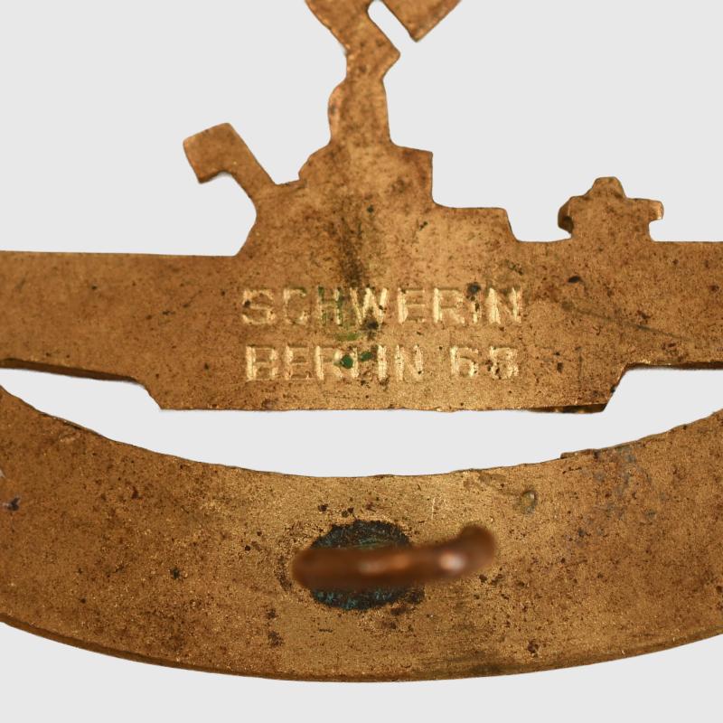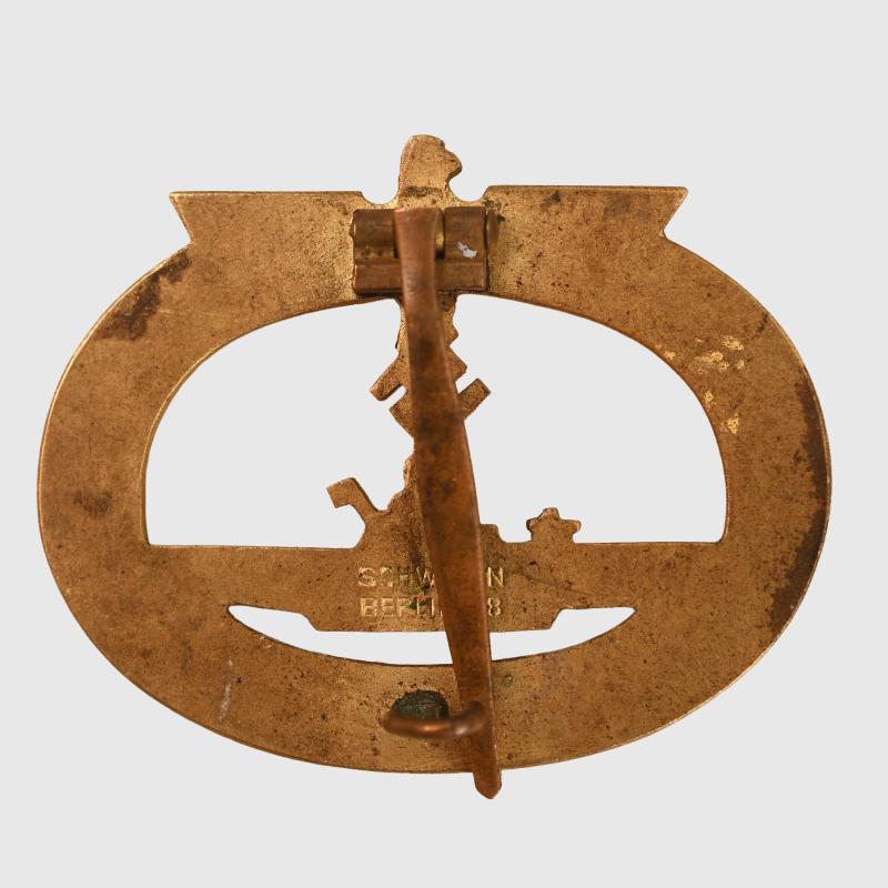 A fabulous example of the Submarine Qualification Badge produced by Schwerin, Berlin. The face side has all its original gilt with frosted highlights. Complete with its original pin, hook and hinge. Marked ‘Schwerin, Berlin’ on the hull of the submarine on the reverse side. It is difficult to better this example.