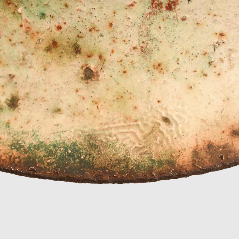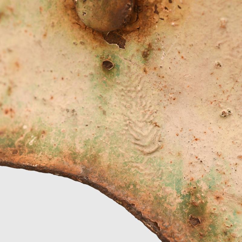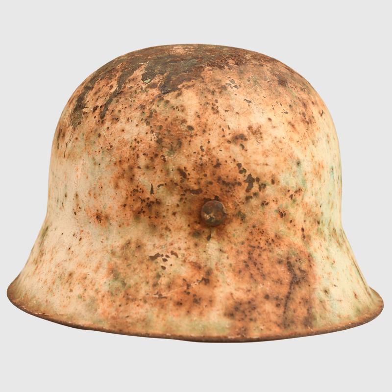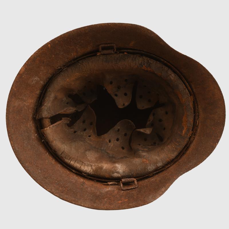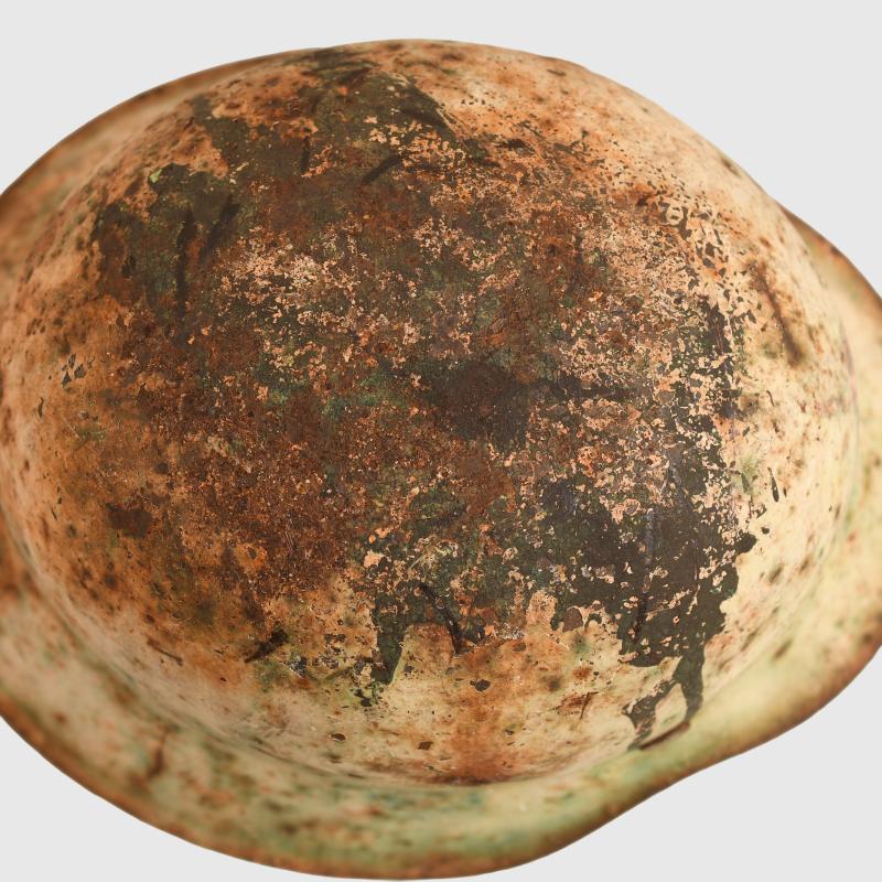 A fabulous barn find helmet being an M.42 raw edge combat helmet, painted white with the remains of its red cross to the face side. Considerable rust bleed in the crown area, where the white paint has removed itself revealing the original grey green paint below. Other parts of the helmet have rust bleed with, not only rust marks, but with the colour of the grey green below flooding through. To the front of the helmet can clearly be seen the outline of a red cross. To the interior the complete shell has a thin layer of rust. The original liner is all complete, the stitching at the reverse side has split but all the tongues are present. A super rare barn find helmet.