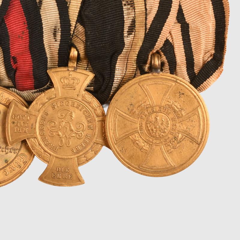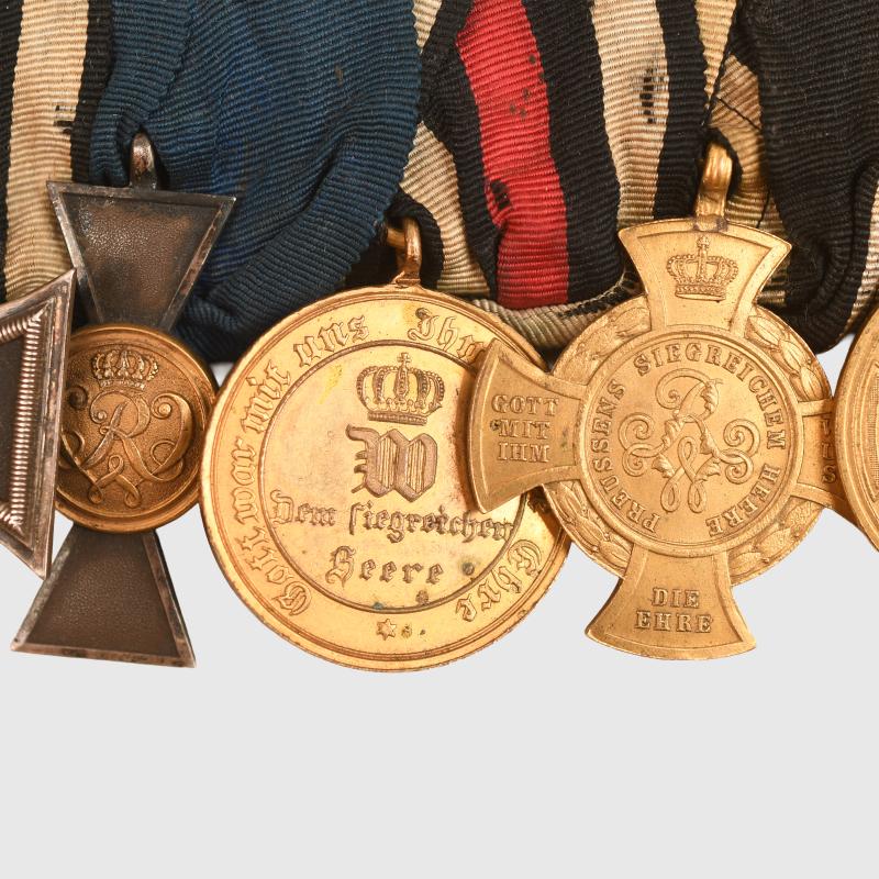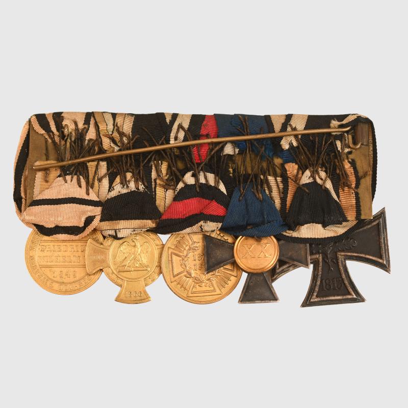 A scarce group of five awards comprising the 1870 dated Iron Cross 2nd class, a Prussian 20 year Long Service Medal, the 1870/71 Commemorative Medal, the Prussian Hohenzollern Medal of 1851, finally the Prussian Commemorative Cross 1860. Ribbons faded and worn, all mounted, its original mounting pin complete with the last bit of the retaining hook broken away on the reverse side.
