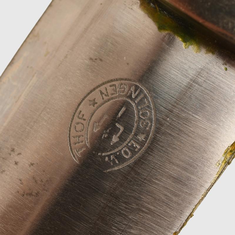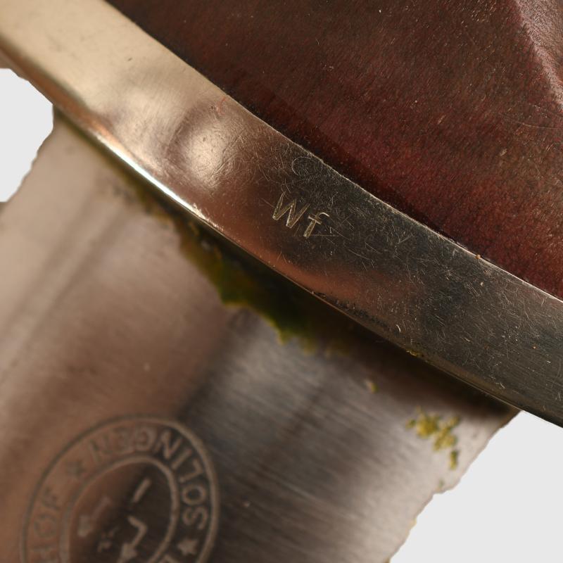 An excellent blade by Wustof of Solingen, the face side ‘Alles Fur Deutschland’ etching good and deep with much cross grain finish remaining to the blade and brightness. The reverse side, no lettering left where the Ernst Rohm inscription was originally laid. The grinding wheel has taken away the top part of the Wustof logo. Excellent quality upper and lower heavy nickel cross guards with an undamaged brown wood grip having a very high quality national eagle and undamaged SA inset. Very good fittings to the scabbard. One minor indentation to the lower ball. It would appear that the original brown anodising to the scabbard has had some form of lacquer laid over it. Complete with its leather strap and its belt loop. Group marked ‘WF’ for Westfalia on the reverse side of the lower cross guard. The sale of Knives, other Edged Weapons and Firearms are restricted to those aged over 18. Verification of age is required before purchase is concluded, this will include providing a scan of photo ID including your address and in some cases may require video verification by FaceTime or WhatsApp video, at Regimentals discretion, until formal laws on this requirement are enforced in the UK.