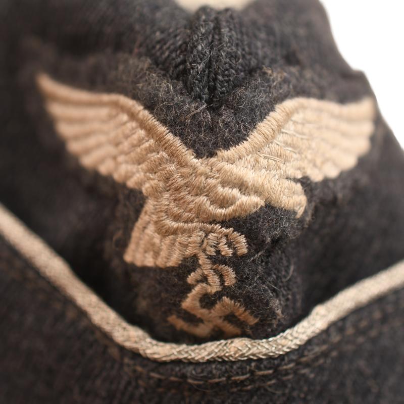 Constructed in the standard Luftwaffe blue grey ribbed material. Stamped size ‘57’ to the inner grey satin lining. Silver waffenfarbe to the boat shaped sides of the cap. Fitted with an enlisted ranks set of embroidered eagle and cockade.