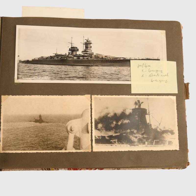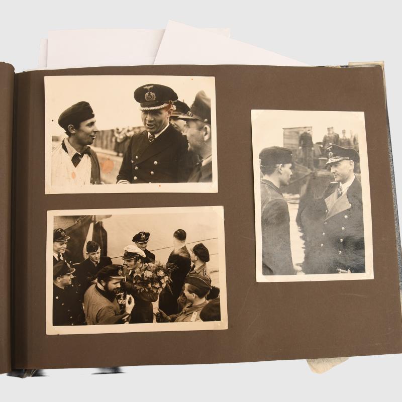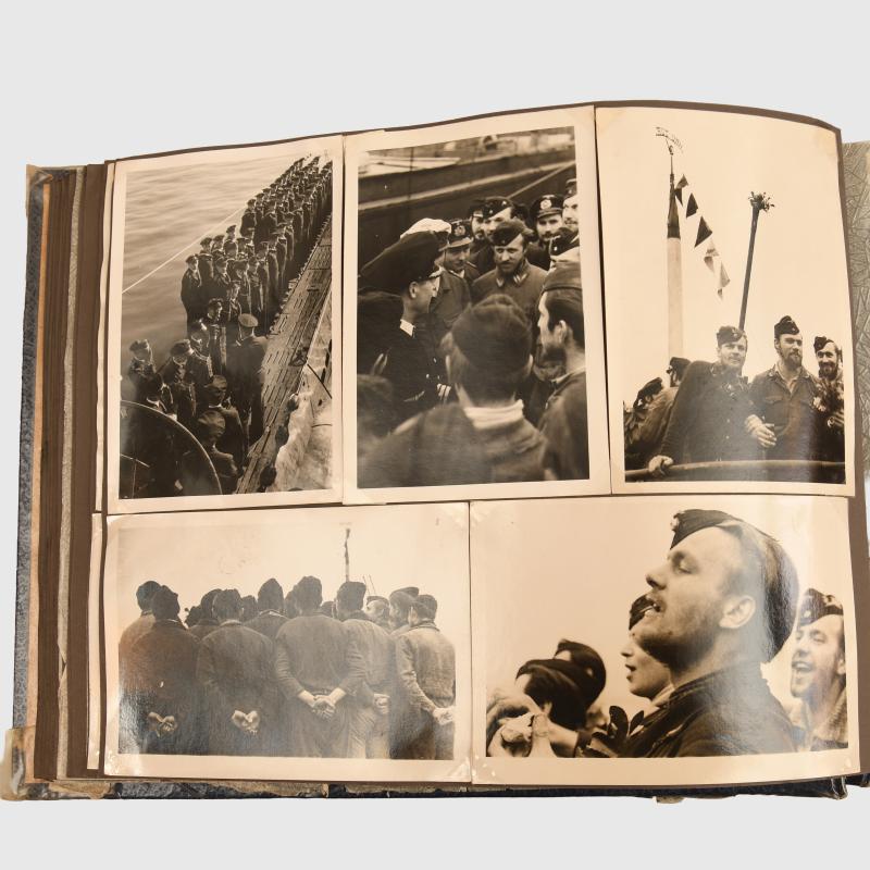 Two superb albums belonging to one submariner, a total of 501 photographs in both albums. The earliest album begins with images of a cruise possibly prior to his serving in the Submarine Service, in southern climates. Scenes of submariners at rest and sport, then scenes of a bullfight in Spain, this may be during the Civil War but no dates are annotated. The album then moves into Submarine Service, images of crewmen on deck wearing their grey deck leathers and Mae West lifejackets. The Commander addressing the crewmen. The images seem to be taken after a submarine cruise as most of the men are unshaven. Pictures on the flak gun on deck at sea, pictures of the conning tower anti aircraft gun, officers wearing white top caps. Various types of grey leather deck suits being worn. Shots back at their submarine base. Unusual shots of Kriegsmarine men wearing tropical visored field caps, location unknown. French chateau indicating it may be close to their base. Naval soccer scenes. A broad shot of a submarine with conning tower insignia visible, we have not been able to identify it. Excellent close-up shots of another conning tower insignia. Images of the famous Knights Cross Winner Lehmann-Willenbrock. Flowers being awarded to a submarine captain wearing his white top cap. Good close-ups of Naval Admiral congratulating one of the sailors on the deck of a U-Boat. Many other highly interesting submariner related images, both on deck on shore. Cartoon type postcards of flimsily dressed women. One very large format shot of the crew in their deck leathers on the deck of their submarine in port. A naval band actually assembled on the deck of a submarine playing. A small grouping of what appear to be post war images. The second album beginning with an image of the Battleship Scharnhorst. A beautiful long shot of a submarine, the submarine is the Type UA, which was built for Turkey but never delivered. More shots of Kriegsmarine personnel at rest. Dockside, large ships. Many images in this album annotated. U-Boat depot ships. Submarines on manoeuvres. Kriegsmarine barracks images, all annotated. Individual photographs of higher ranking officers. An image of a U-Boat officer, non annotated but appears to be Gunther Preen. Pictures of U-46 in dock. More close-up images on submarines. Submarines in the Kaiser Wilhelm Canal. One large image of the Battleship Graf Spee. Another image of the Graf Spee sinking. Internal shots, which were canteen purchased of the interior of the Linenshiff Robert Ley, part of the Strength Through Joy Organisation. Some of the last shots in the album are taken from the conning tower of the submarine while in heavy seas. Also images of other members of the conning tower crew at their stations. Two superb albums, worthy of much deeper research, and if possible extra viewing in person. More extensive, extra images can be seen on our new Premium website, type in regimentalsmilitaria.co.uk in to your web browser.