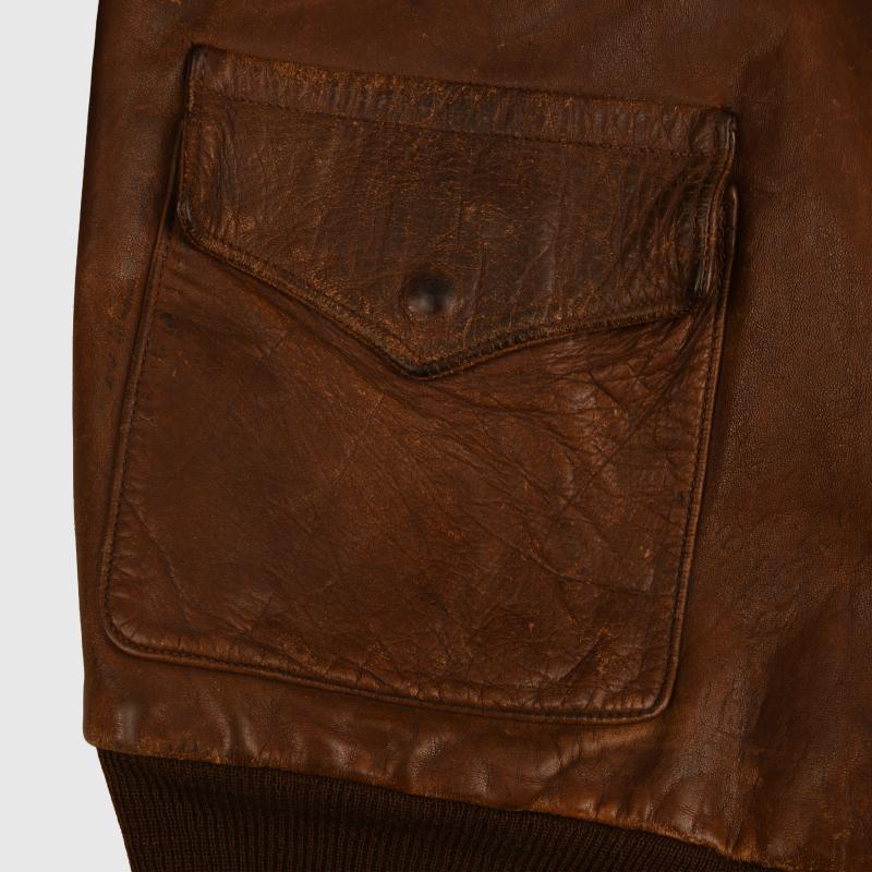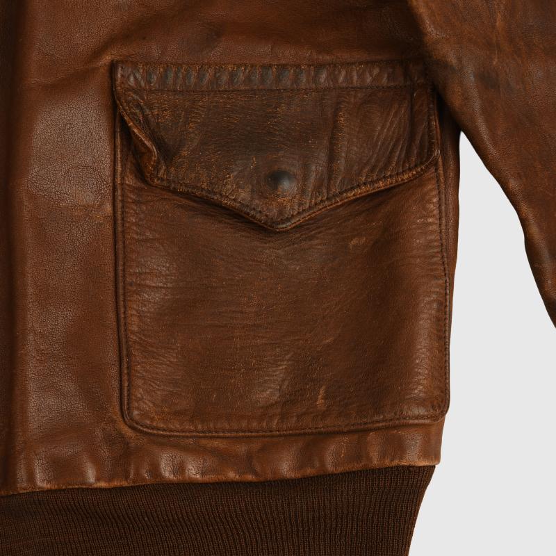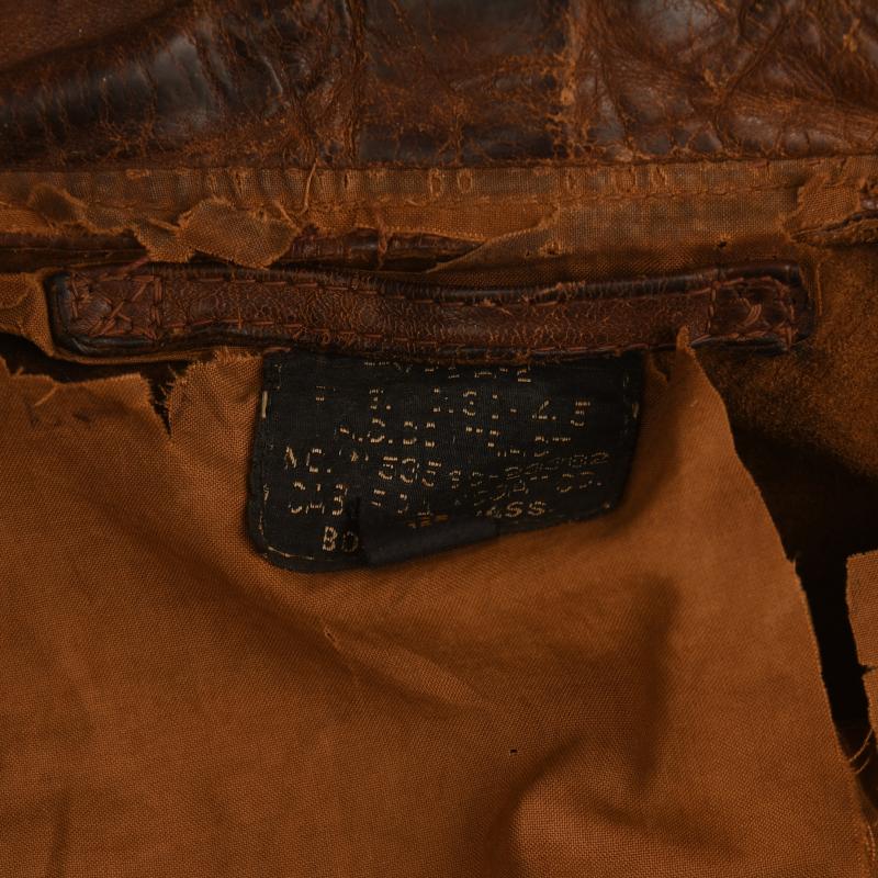 A very nice condition size 40 A2 leather flying jacket, manufactured by the Cable Raincoat Factory of Boston. Standard configuration, two front pockets with flaps secured by male/female pop studs, woollen bottom band and cuffs, collar secured with male/female pop studs, two faux epaulettes. The jacket has seen considerable combat wear but has no leather rot, stitching strong overall, the skin is slightly thin on the corner of both shoulders, lining good but the usual torn places around the upper inner rear collar area. The zip is manufactured by Kwik and is present and fully functional. Some tears to the cuffs and bottom band but are original to the jacket. The remainder of the lining is excellent. Painted to the front upper right hand breast are a set of bombardiers wings, a squadron patch below, which we have not been able to identify. To the left hand breast the outline of a Liberator bomber with a series of 35 bombs indicating 35 missions completed by this U.S. Army Air Force bombardier. We have been unable to identify the squadron patch. A rare jacket of WWII with the wearer completing 35 bombing missions over enemy territory, where a survival rate was very slim.