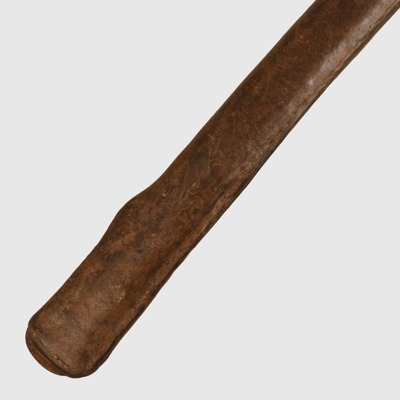Generally good blade, bright, with its long single fuller, numbered ‘63857’ with its standard NCO cut out cross guard (tsuba). The aluminium faux wrapped hilt with some oxidisation, still with its hanging ring and its closure catch, Japanese ordnance marked on the lower part of the hilt, in its scabbard, which is number mismatched, which unusually for an NCO sword has a leather combat cover. The combat cover has a small section of possibly 20cm where the stitching along the closure seam has opened. The sale of Knives, other Edged Weapons and Firearms are restricted to those aged over 18. Verification of age is required before purchase is concluded, this will include providing a scan of photo ID including your address and in some cases may require video verification by FaceTime or WhatsApp video, at Regimentals discretion, until formal laws on this requirement are enforced in the UK.