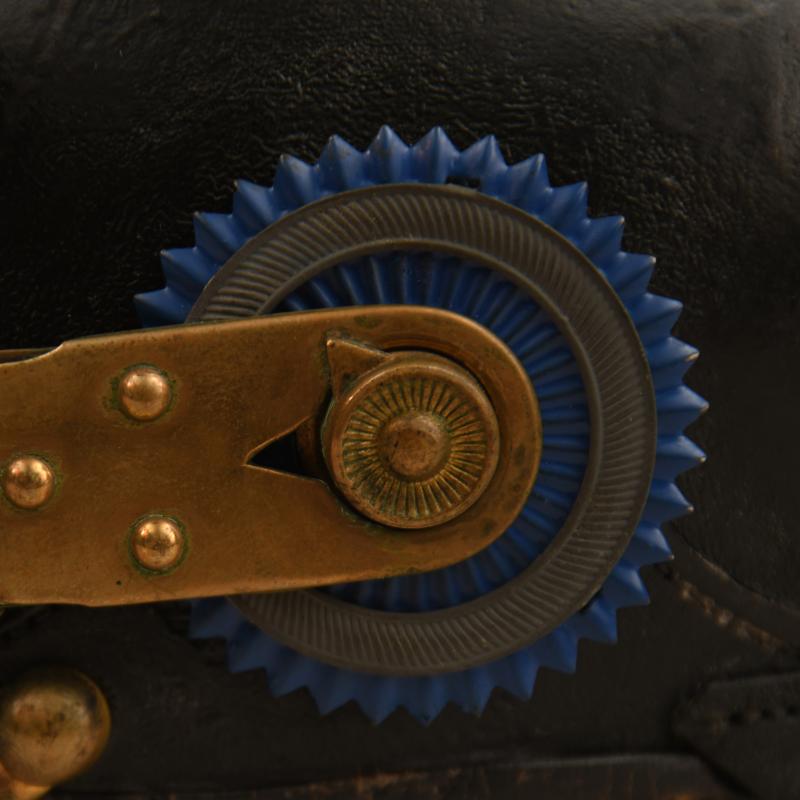 A very nice condition all leather pickelhaube being in an unusually large size. Both peaks securely attached to the main body, stitching has not rotted. The front plate is an officers plate having the motto ‘Fuerst’ to a scrolled base eagle’s head, cut out officers crown, nickel overlay plate of Brunswick Infantry Regiment used up to 1912 with the scroll Peninsular below all in white metal. Standard flat NCO type clip-over chin scales. NCO national and Brunswick State cockade. Officers tall spike. NCO domes to the lower section of the spike base and also the circular plate holding the spike base to the helmet. Officers quality lining. Good colour to the scallop edge leather sweatband with the internal silk still intact but shredded in places with an original owner’s name hand applied in large scroll lettering to the inside, with a hand applied size ‘59’. A rare helmet to this regiment.