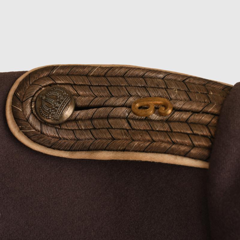 A very nice condition large size field grey leutnant’s tunic for Prussian Infantry Regiment No.9. The tunic is in a nice slightly lighter shade of field grey. Completely free of any moth damage or staining. Apple green stand collar. Stitch-in wide white underlay shoulder boards with Prussian black and silver fleck with gilded Regiment No 9 to each board. The tunic is basically M.15 style with fly front, deep turned back cuffs, M.15 skirted back. As the war progressed after 1915 officers were finding that the model 10 and 15 having just two lower pockets was not enough for the amount of items they had to carry whilst in the trenches, or in general service. Many officers when ordering tunics had them constructed with two upper breast pockets with flaps and pleats, the two lower pockets are identical to the M.15 and model 1910 style. A faded Iron Cross ribbon to the upper right breast, all the original buttons are in place, the lining absolutely complete. The traditional two inner hidden pockets in the rear skirt are present. Many images exist of these tunics being worn and they were especially favoured by aviation officers. This item sold by Regimentals some years ago and just re-purchased.