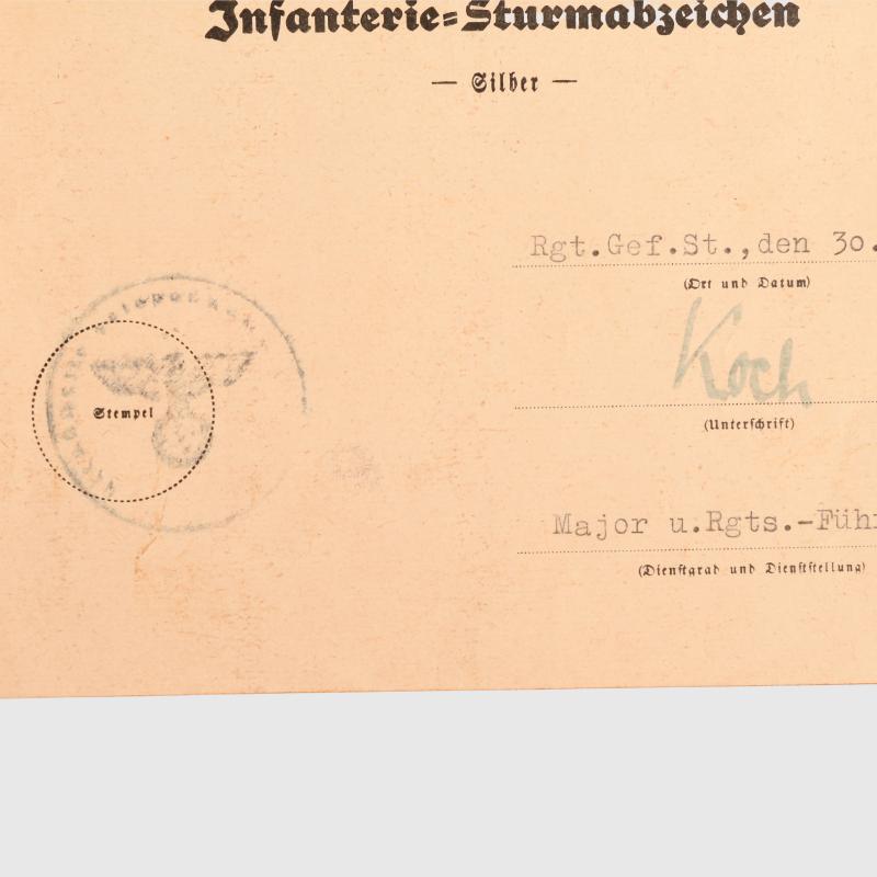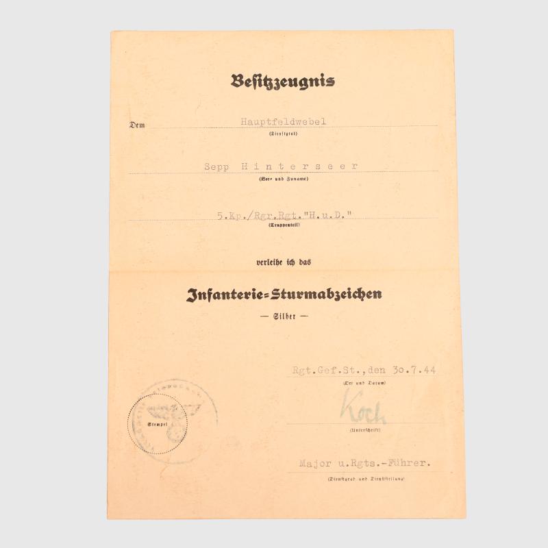 A rare award A5 size citation, folded once, a pair of documents, Wound Badge in silver with the full definition of the unit on the second line, dated ‘20th September 44’ with a doctor’s ink signature, accompanied by the Infantry Assault Badge in silver dated ‘30th July 1944’ with the ink signature of the Regimental Commander with the unit issue stamp. The Hoch-Und-Deutschmeister Regiment was named after one of the most famous regiments of the former Imperial Austrian Army. After being destroyed at Stalingrad it was re-formed in June 43 as the 44th Hoch Und Deutschmeister Infantry Division and sent to Monte Cassino in November, after spending 1944 in Italy it was transferred again back to the Eastern Front to take part in the German Plattensee Offensive to relieve Budapest.