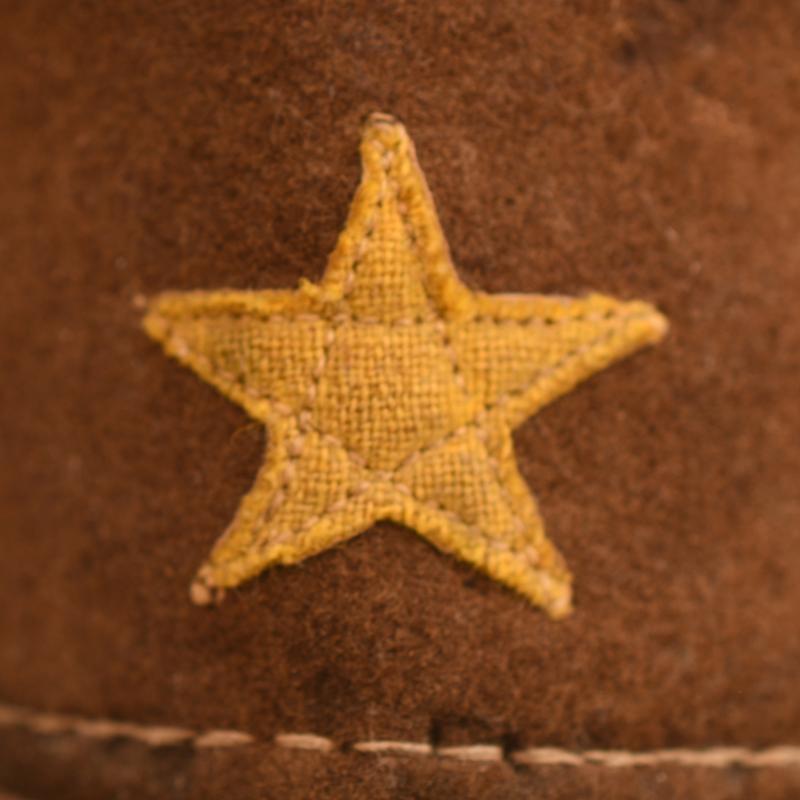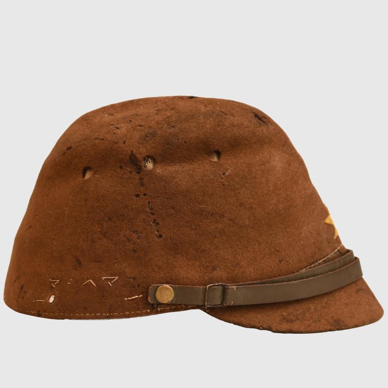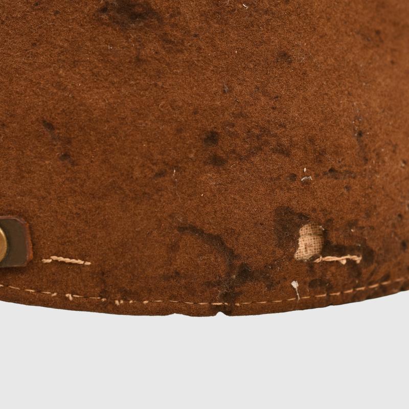 Staining with one moth hole. Kanji letters on the right hand side indicating a name. Three air vent holes either side. Complete with a strap, side buttons, yellow star to the front. Ersatz type sweatband complete but creased with many kanji stamps and letters to the interior.