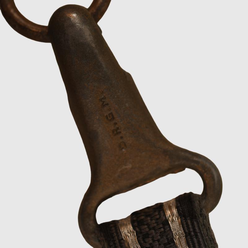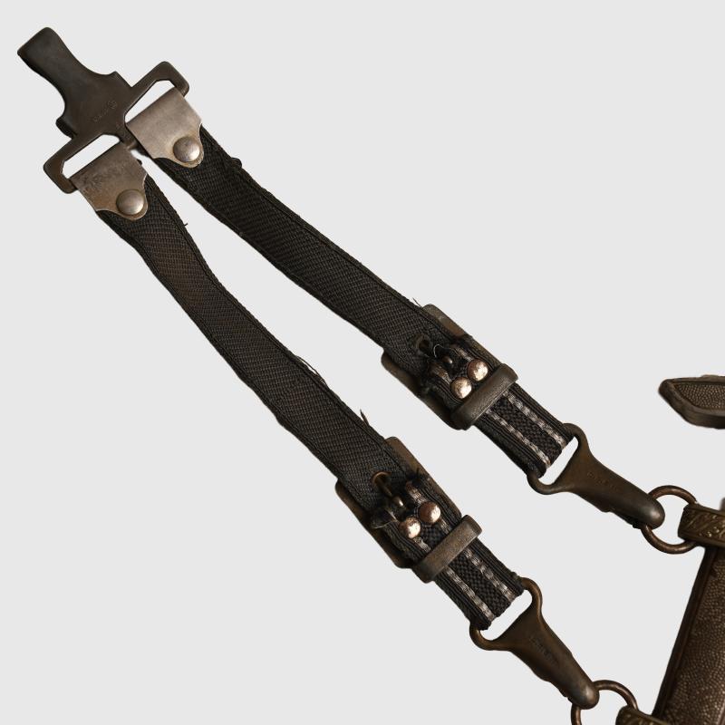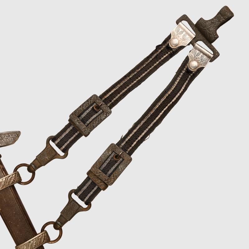 The blade is not abused, slightly dull. Good clear SMF and Luftwaffe acceptance stamps. All matching grey finish to the upper pommel, cross guard and scabbard rings. The main body of the scabbard being of a totally different material has retained its more steel finish. Two chips to the upper part of the deep orange grip. All grip wire complete. Short pattern portapee knot and the late pattern unlined brocade straps, which have frayed slightly. More extensive, extra images can be seen on our new Premium website, type in regimentalsmilitaria.co.uk in to your web browser.