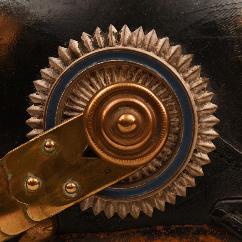 A nice condition all leather cavalry officers Pickelhaube, a small size helmet, both peaks securely attached to the main body of the helmet, some congealing to both front and back peaks, gilt very good overall, with its large Bavarian front plate and cut out officers crown, fitted with its officers national and state cockades, and its correct wartime period clip over chin scales. The interior mid brown leather liner all good and complete with its inner light tan silk lining. Helmet fitted in its original carrying case.