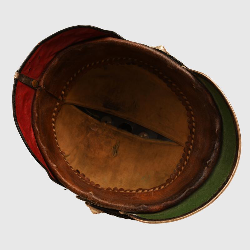 A very large size all fibre helmet for an officer in Saxon Infantry Regiment 100, this is the only Saxon Regiment to have all silver fittings and its full title is the 1st Leib Grenadier Regiment. One minor indentation to the crown on the rear right hand side otherwise the skull is excellent. Some minor creasing at the lower edge of the crown at the rear where it meets the rear peak, both peaks firmly attached to the main body. All of the silver finish very good and nicely toned with age. The protruding Saxon front plate in silver with its gilded overlay. The helmet has its larger size Saxon style non serrated edge national and State cockades. To the interior the mid brown scalloped edge sweatband good with evidence of wear use with its inner light tan silk, also with conversant wear as to the leather. The front and rear inner peaks being lined respectively in red and green. In its original carrying box. More extensive, extra images can be seen on our new Premium website, type in regimentalsmilitaria.co.uk in to your web browser.
