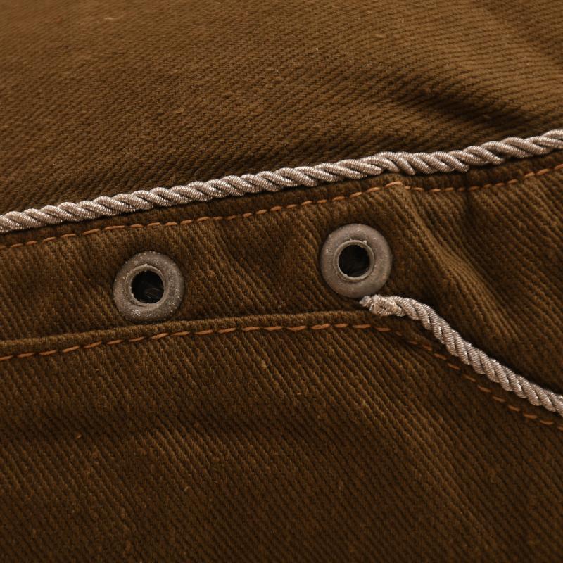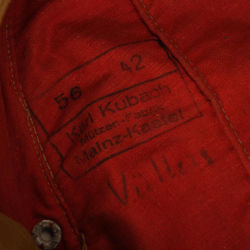 A nice example, size 56, of a 2nd pattern tropical visored field cap with its untouched Bevo woven blue on tan eagle and cockade, with the field adaptation of officers corded style piping to the crown and front scallop of the cap. The paint has lifted from the zinc eyelets. There is no damage on the cap. Evidence of wear use to the interior with the original owner’s name applied. As well as the size stamping there is the model number ‘42’ and the maker of ‘Karl Kubach, Mainz’. The only unusual feature of the Kubach made caps is that the sweatband is a combination of leatherette and canvas.