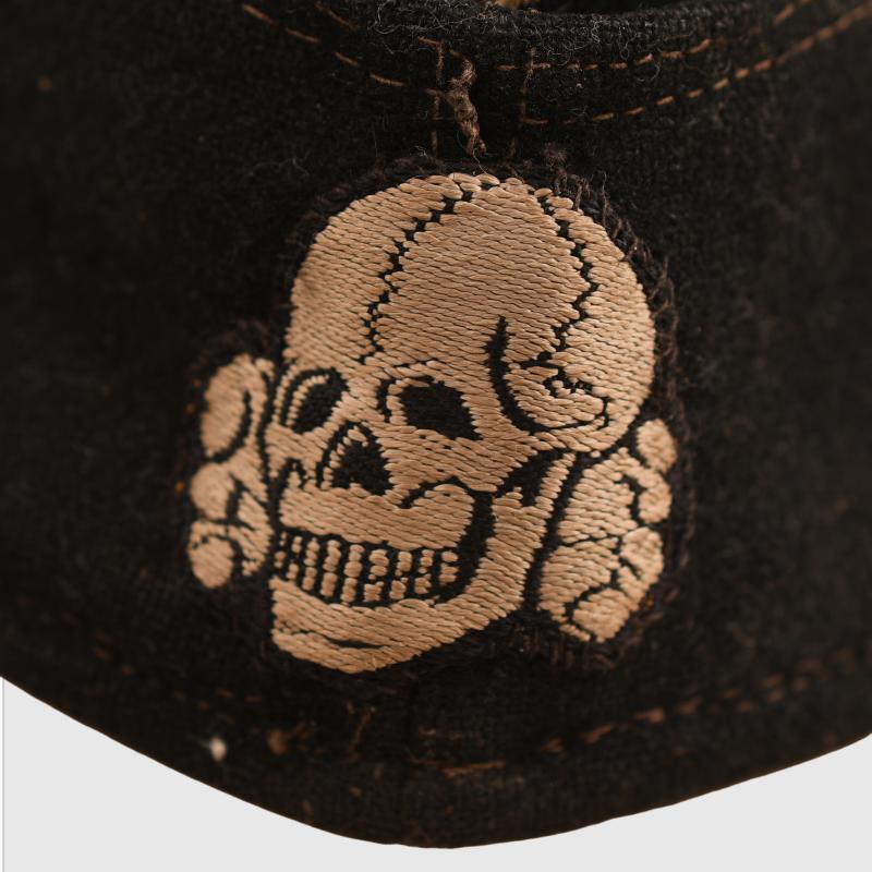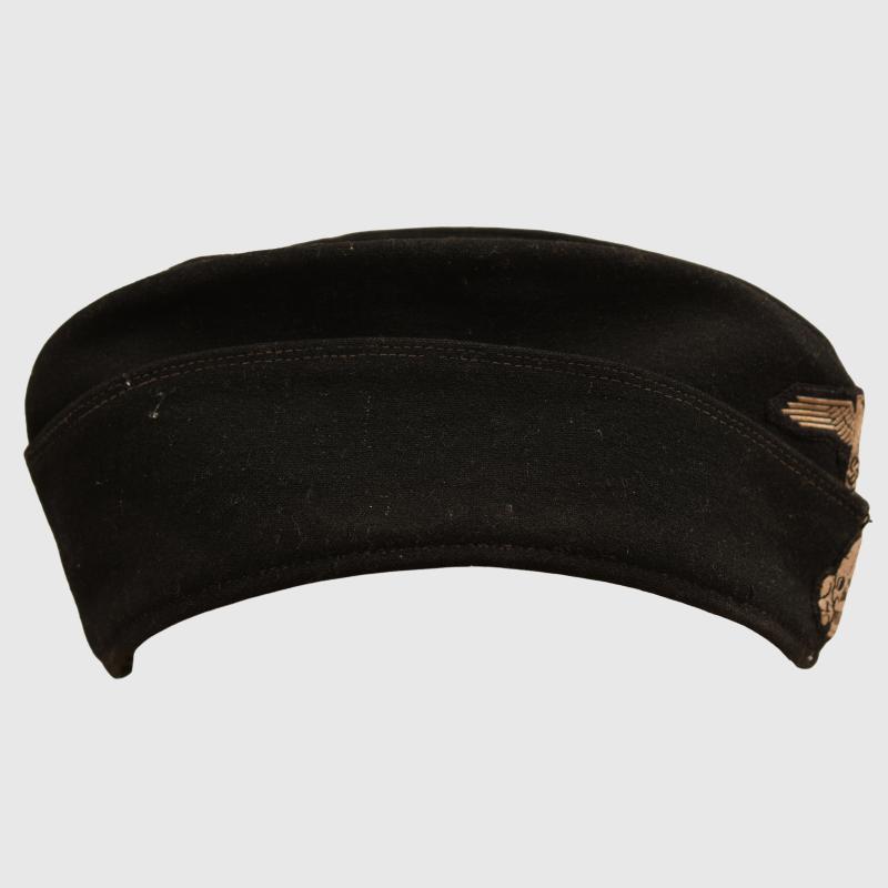 A very nice example of a Waffen SS black boat shaped overseas cap. A superb untouched example. The nap is thin in places to the exposed parts of the cap, on pulling down the side curtains the original nap of the cloth can be seen. The stitching around the boat shape and the base of the cap has rotted in places. There is no moth anywhere. On opening the upper envelope the nap of the cloth again excellent, as it has been protected, with its completely original Bevo woven Waffen SS skull and eagle. To the interior the dark grey bordering on black heavy duty cotton lining, no visible markings, on test we have approximated the size at 54 or 55.