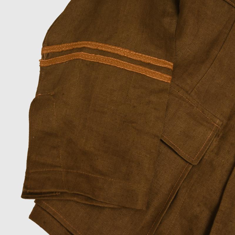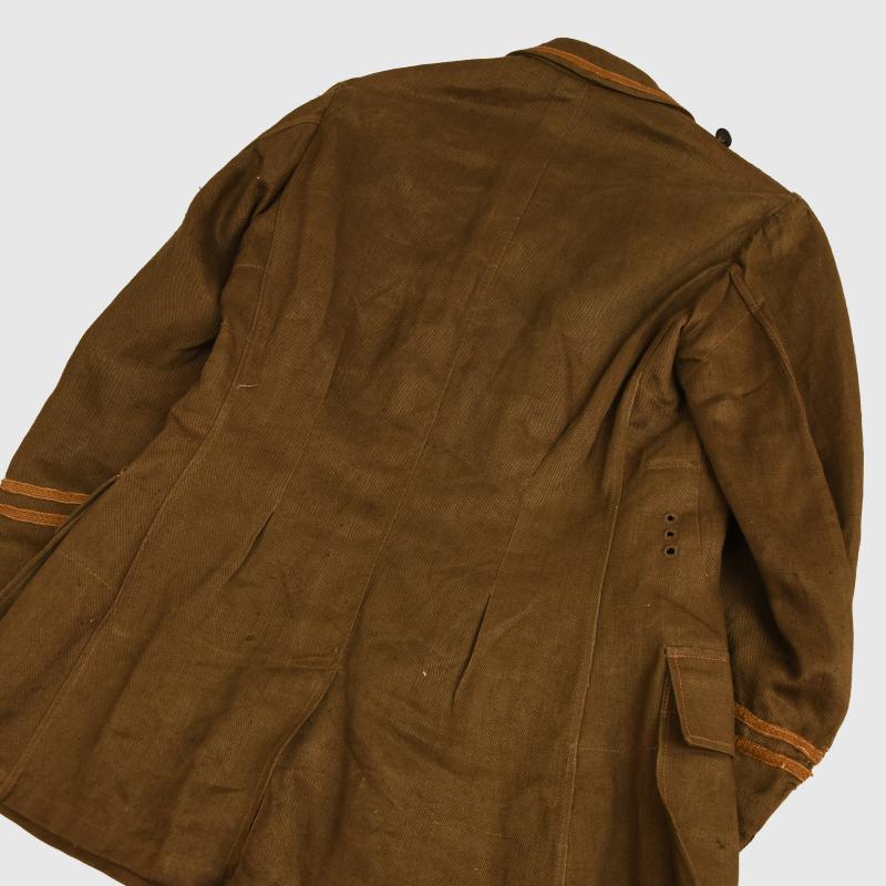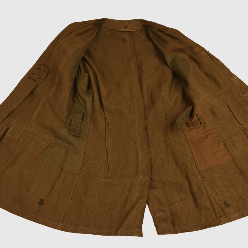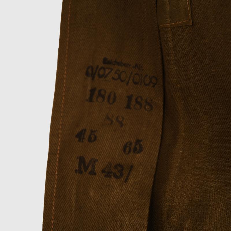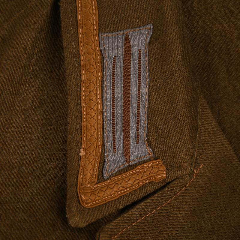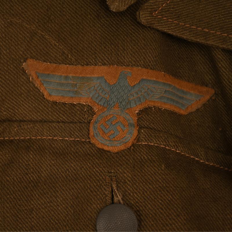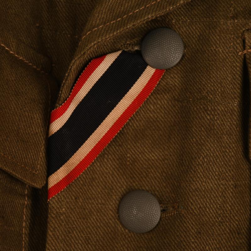 A very sparsely worn large size 3rd pattern tropical tunic, mainly worn in southern Italy and the Balkans, also worn by the Indian Volunteer Legion. Standard four pocket configuration, five button closure. The straight pocket flaps indicate this is the last pattern of tropical tunic. Complete with its machine stitched blue and tan Bevo woven collar patches. Two rows of Der Speiss tropical lace to each lower sleeve and around the collar. There is a section of War Service Cross ribbon to the second buttonhole. The original 2nd pattern eagle at some time in its life has been removed and has been replaced with the scarce 1st pattern eagle. Very nicely marked to the inside flap of the tunic RB numbers, size stampings and the designation ‘M43’. All closure buttons and pocket buttons are of the removable type. No damage, no stains, shoulder boards missing.