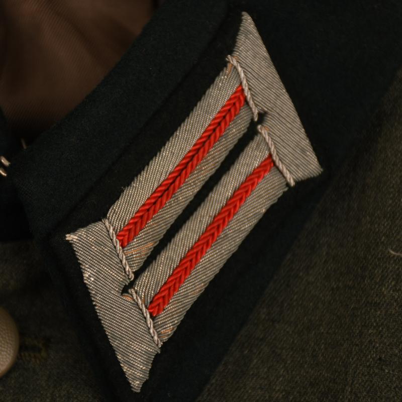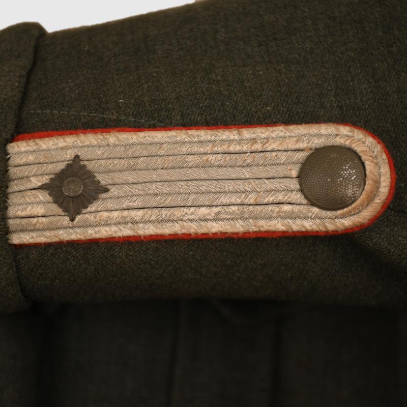 A very nice condition upper medium size four pocket combat tunic with scalloped flaps and pleats to each pocket. Deep turned back cuffs. One single small vent on the reverse side. Constructed in the heavy canvas type of material, very similar to the captured Italian cloth. Standard dark green officers collar. Fitted with a set of stitch in Oberleutnant shoulder boards with red artillery based waffenfarbe, slight oxidisation to the silver weave on both of the shoulder boards. Heavy bullion wire red artillery centred collar patches. Matching officers wire woven breast eagle with some threads slightly oxidised. Interior pocket with a ‘Max Reichwald, Oberhausen’ tailors label with the Leutnant’s name hand applied with the date ‘21st December 1944’. Unusual to find late war dated tunics. A single interior DRGM marked aluminium sprung loaded clip for the display of an army officers sword or dagger with a neatly tailored hole through the lower left hand pocket as the tunic is worn for the hanging strap to pass through. No moth anywhere on the tunic, damage staining or repairs. All of the buttons are the combat subdued grey painted variety.