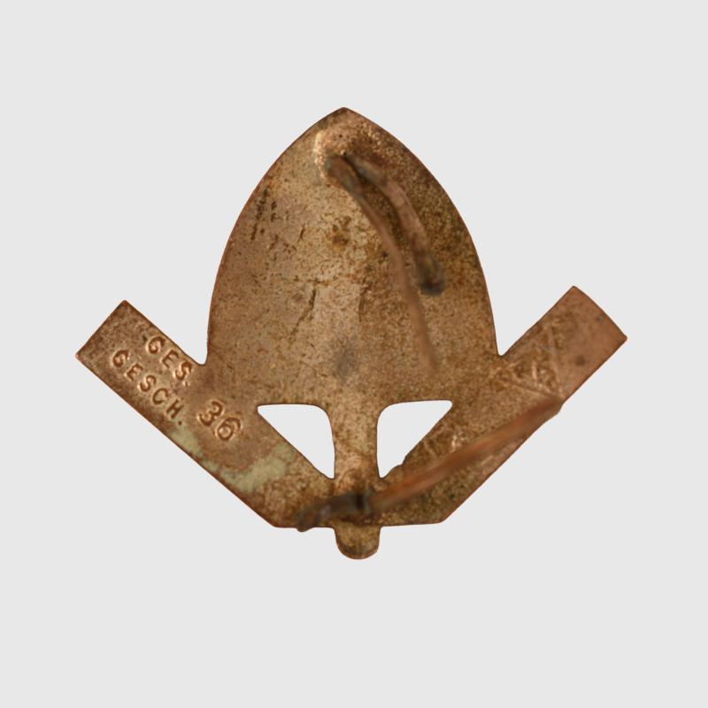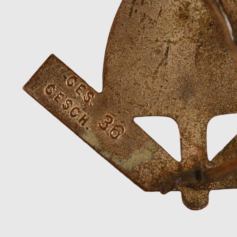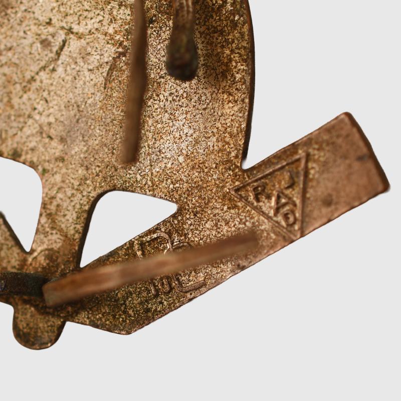The very finely enamelled black, white and red RAD insignia for the officers cap. One chip to the enamel lower right hand side of the spade, complete with its fixing prongs on the reverse side, one prong missing. Profusely maker marked and RAD acceptance stamp on the reverse side in four places with what appears to be the date 36.