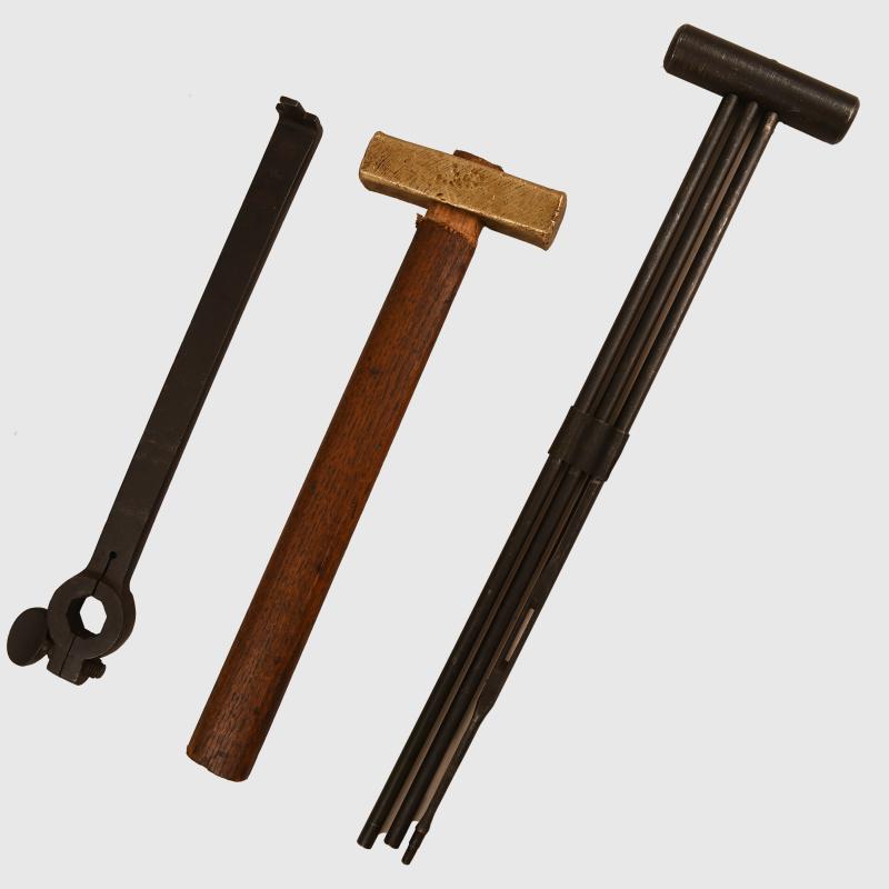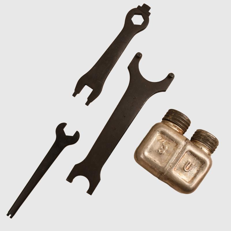 The Austrian produced Schwarzlose machine gun,is one of the hardest machine guns to find of WWI, was an instrument of superb engineering. Approximately 30 years ago a quantity came onto the British market accompanied by many accessories, this is a tool and cleaning kit from that batch. Complete in its original pouch with carrying strap. The canvas pouch is rather greasy and dirty, nevertheless a rare piece of machine gun equipment. Anybody holding one of the Schwarzlose machine guns in the batch that came into the UK would love to be able to get hold of the cleaning and tool kit.