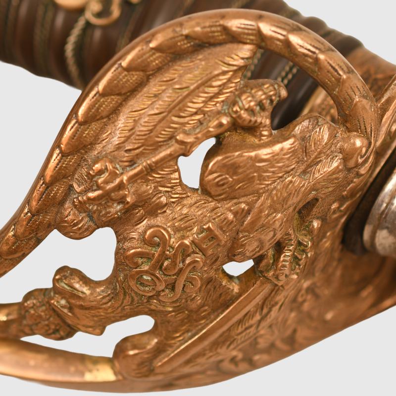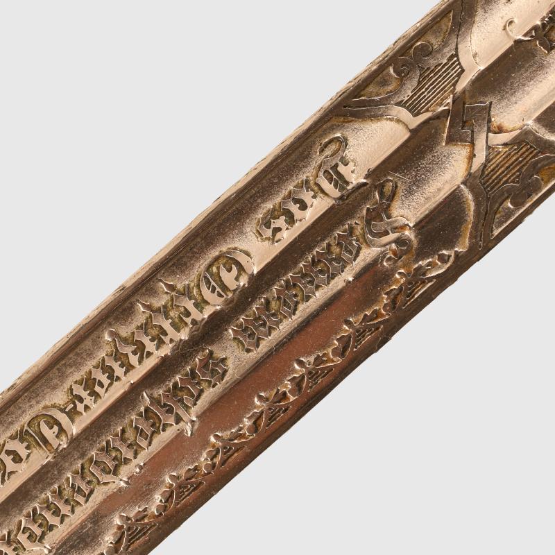 An excellent very long sword of the 1889 pattern. Extra detail to the 1889 pattern hilt, more than standard. Prussian eagle, stands of arms and flags to the upper cap area, also floriated to the inside of the bowl with the mirror image of the Prussian eagle on both sides of the bowl. Composition grip undamaged. Grip wire slightly loose. FWR motifs still fitted to the grip. The extremely long double fullered Weyersberg Kirschbaum & Co, Solingen manufactured blade with double line presentation script. ‘This sword presented to our retiring comrade Herr Oberstleutnant Bickel from the Officer Korps of the 8th Rhenish Infantry Regiment No.70’. The remainder of the blade having Damascus patterns visible. On the reverse side a central scroll reading ‘1892 to 1898’. Stands of arms and the Regimental insignia of Infantry Regiment No.70. The scabbard is in nickel, generally in good condition with one indentation just below the second hanging ring. Complete with its scabbard throat and fitting screws and double hanging rings. Along the flat back strap of the upper blade the name of the Berlin sword retailer.