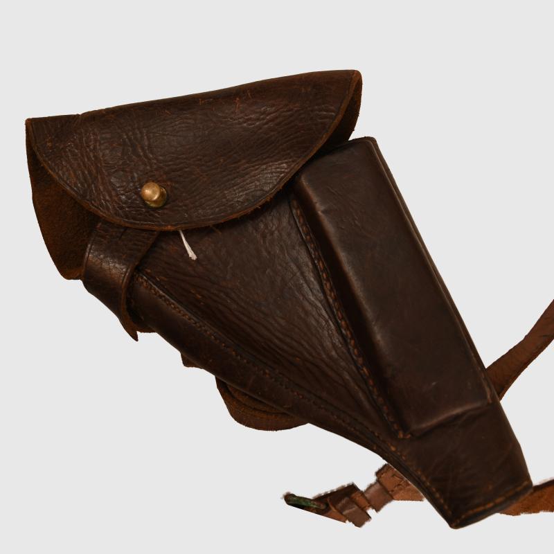 Fine quality British made holster with spare magazine pouch to the face side, complete with the long shoulder strap, which is complete but has become detached from one side of the holster and needs a repair. Another associated leather strap for the leg attached to the holster, some distortion to some of the leather around the flat area otherwise all stitching good and strong. Ideal for an RFC officer mannequin.