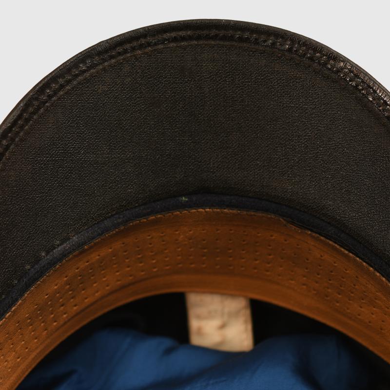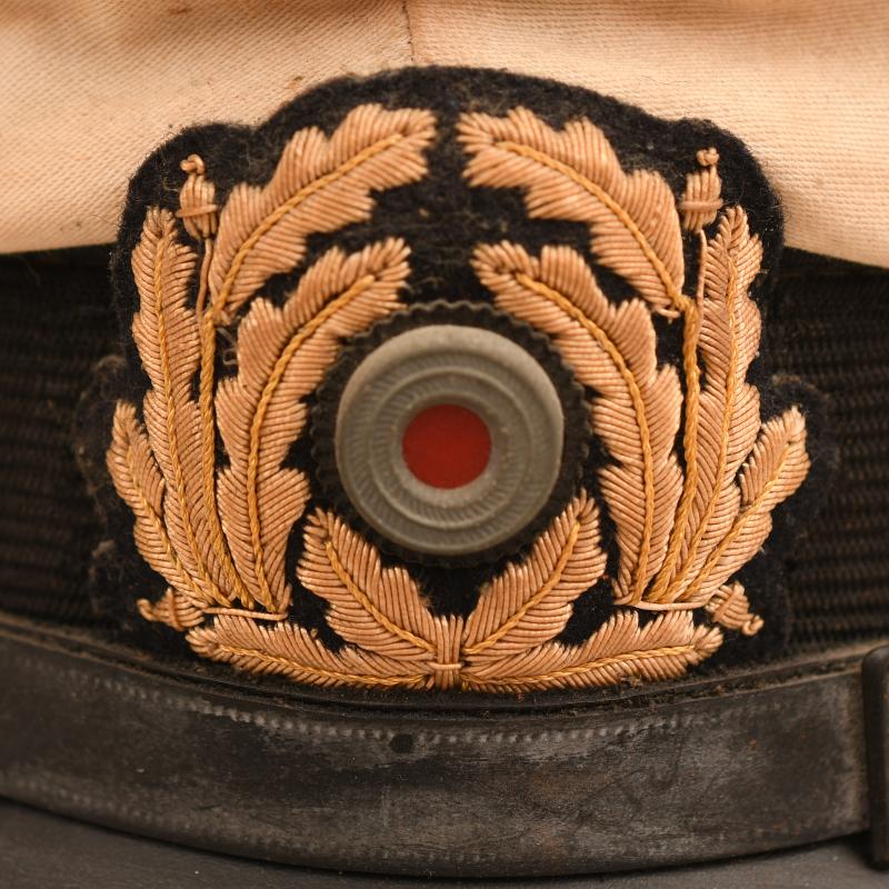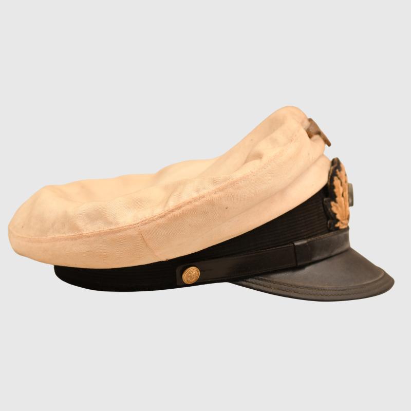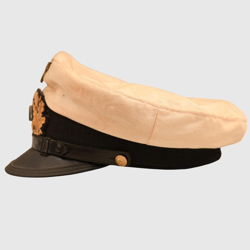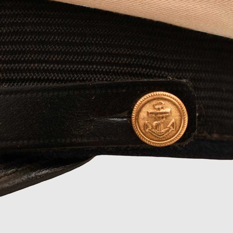 Removable white top over a standard blue cap, very large size, possibly 59 or 60. The white top has toned with age. Complete with its cellion national cockade, subdued gilded removable eagle, standard correct naval chinstrap with naval side buttons. Light tan leather sweatband, undamaged. The interior crown area is lined in blue with a centre celluloid lozenge with an underlay of gold. The maker’s logo below the celluloid is indecipherable, the orange cushion in the forehead area has solidified, By the form of the cap it appears to be a pre war produced cap in a style halfway between the Imperial Naval visor caps and the WWII Third Reich with the larger floppier top.
