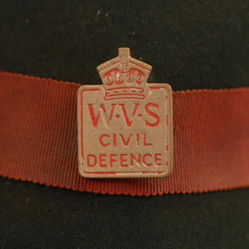 Produced in the WVS green with maroon centre band having the cap badge of the WVS Civil Defence to the inside of the issue label, which reads ‘WVS’ with its inner sweatband.