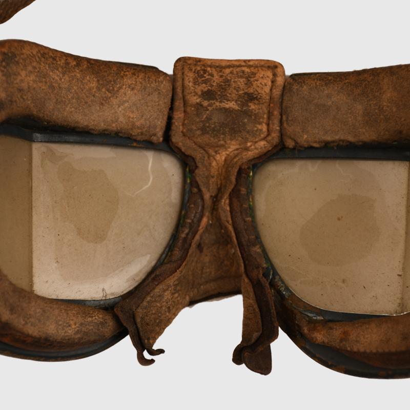 Lenses very dirty, complete with elasticated strap. Good suede to the interior. Minus its flip-up shield. Remainder of nose leather good.
