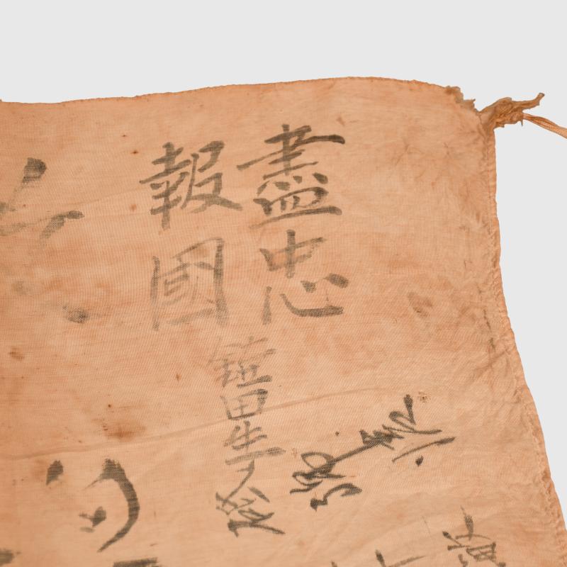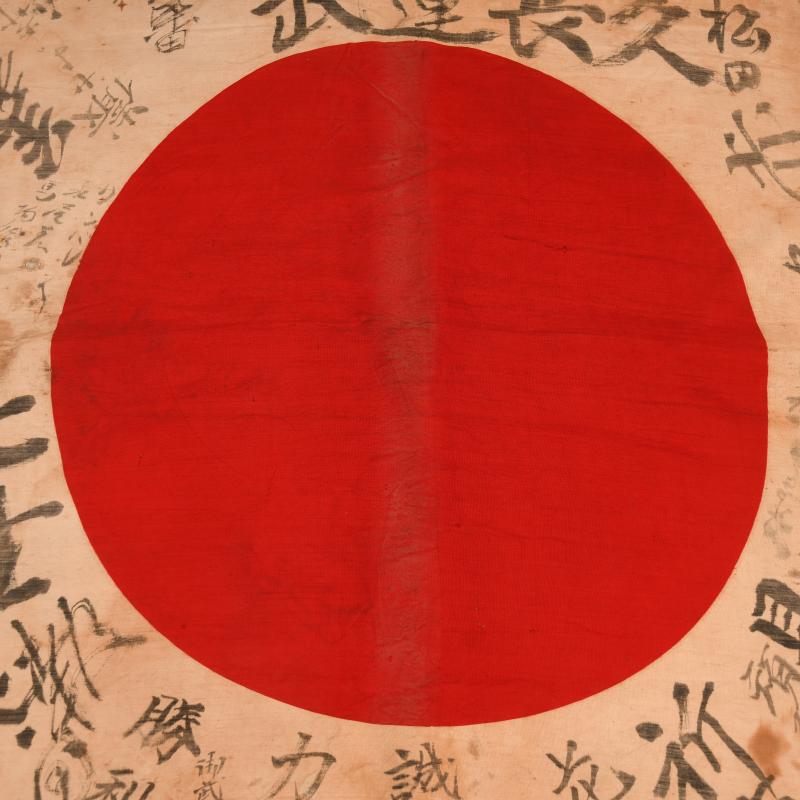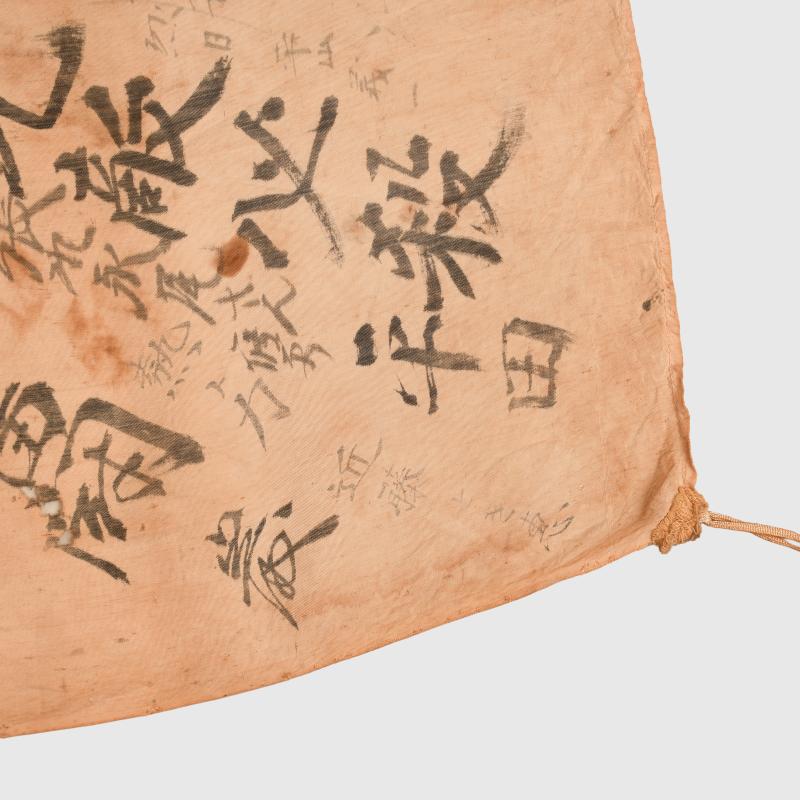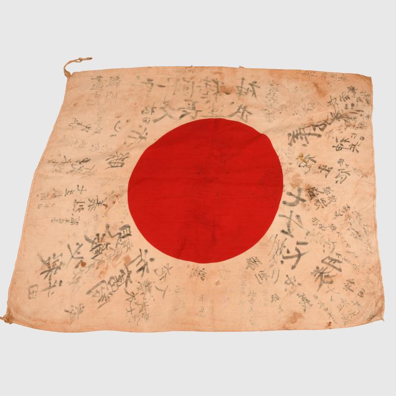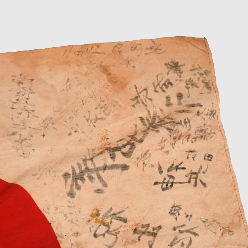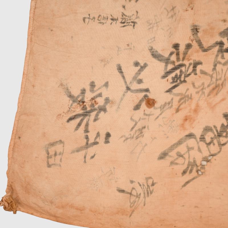 Unframed, 82 x 66cm. Quite a bit of age staining but no damage, both ties still present. Many signatures over the flag.