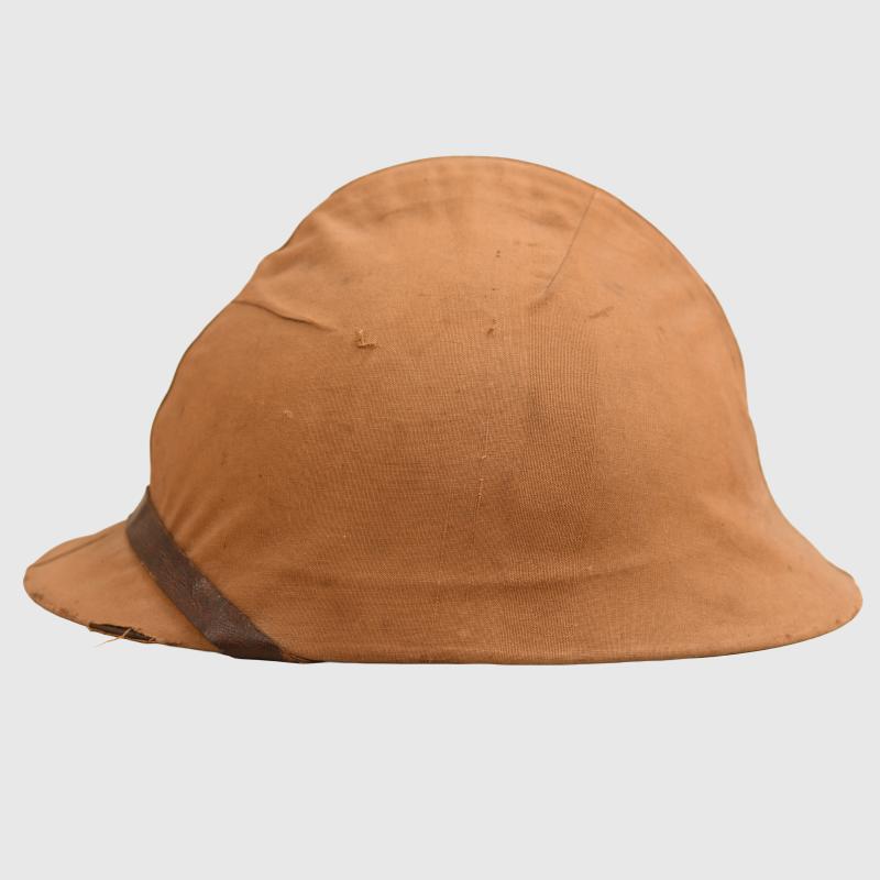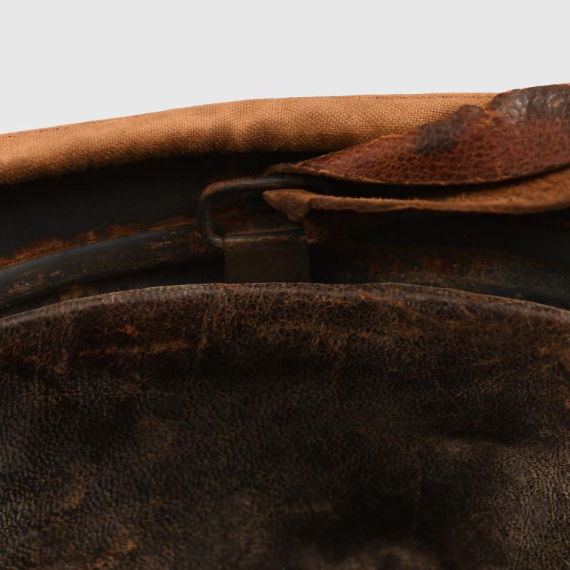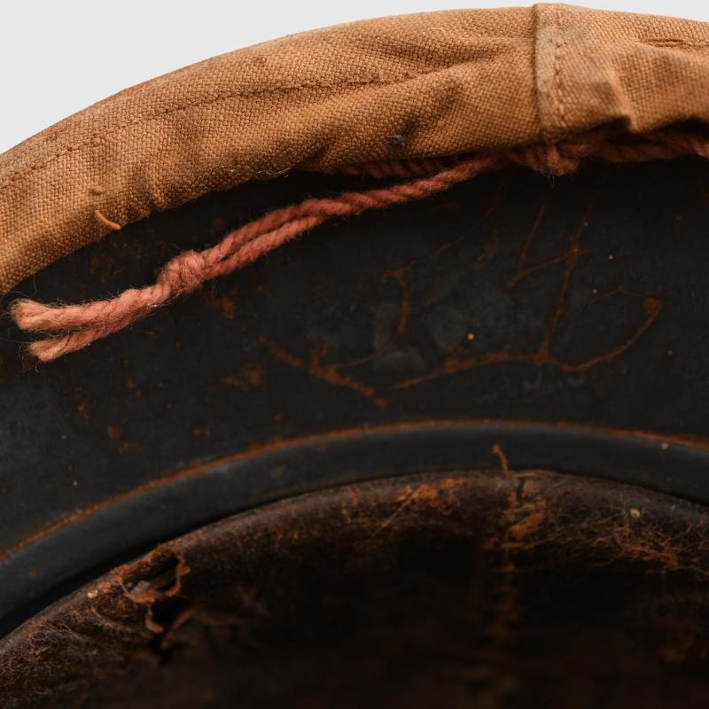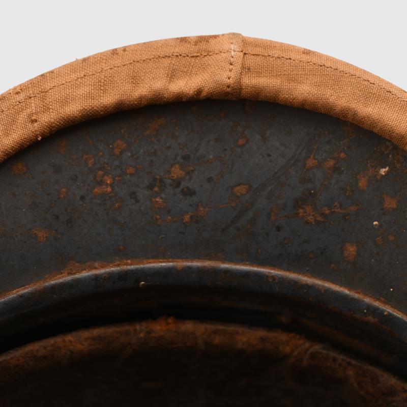Nice condition Adrian helmet in horizon blue retaining much of its original paint finish with some light chippings. An original owner’s initials hand inscribed into the inner rear skirt. Liner excellent. Fitted with a totally original helmet cover for the Adrian helmet, an original cover, which are extremely rare. Slight tearing to the cover on the front brim.