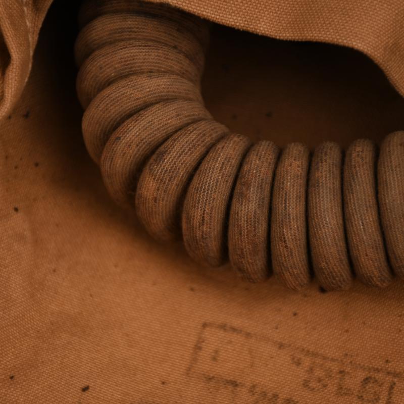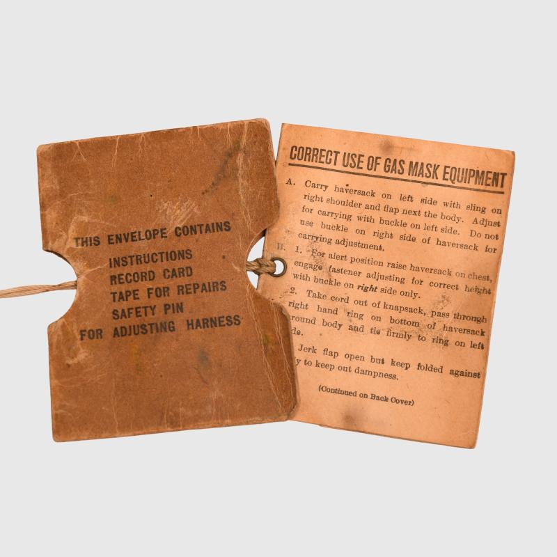 Excellent condition outer bag, broad arrow marked, stamped ‘Waring & Gillows 1918’. To the inner mask the canvas has solidified, all the head strapping present. The tube is good apart from one hole at the join to the filter. The rubber breather system has solidified and broken away from the face of the mask. The bag is complete with its strap and is still good for display on a WWI mannequin. Attached to the long strap is the original card envelope with the instructions for the use and maintenance of the gas mask indicating that this a stored mask and has never been issued.