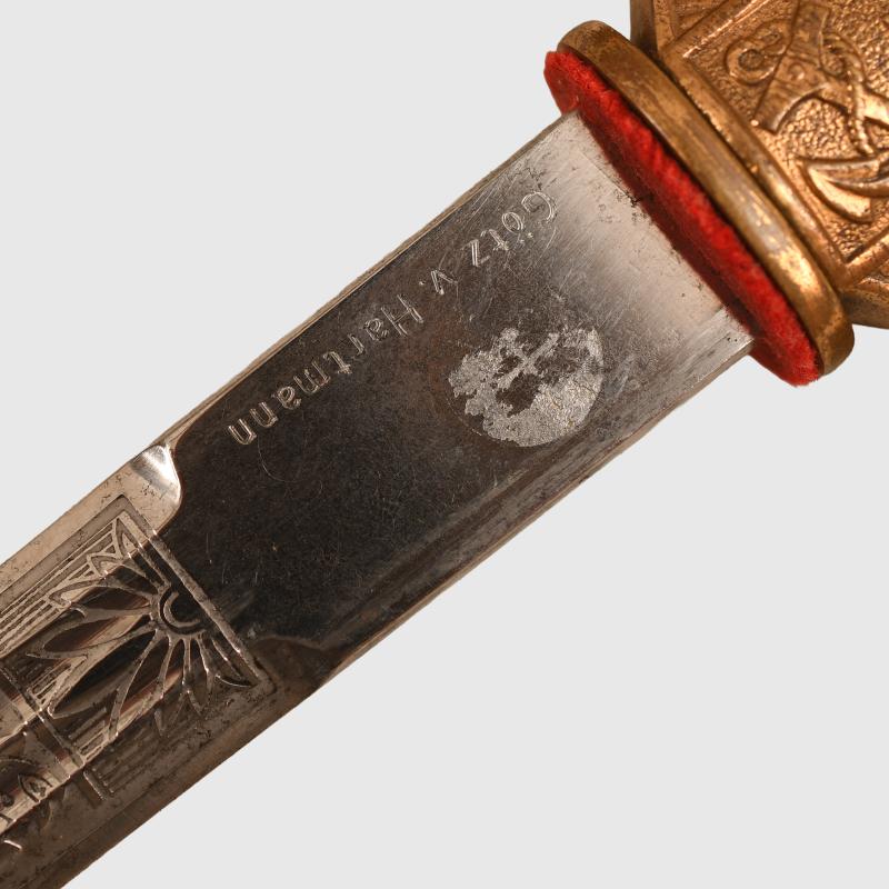 This item was sold by Regimentals approximately 25 to 30 years ago and we have recently been able to re-purchase it. Standard naval officers dagger, blade by Eickhorn, its double fullered blade in excellent condition with standard naval etched patterns. The Eickhorn trademark is clear, complete with its original red felt washer. The white celluloid grip is totally undamaged with all its grip wire. Good traces of gilt remaining to the swastika adorned pommel and the cross guard. Standard lightning bolt style scabbard, again retaining some traces of gilt in the lower areas. Minor indentations to the scabbard, which are generally expected with naval officers daggers. Complete with its two hanging rings, two upper screws present for the throat without the heads being turned. Engraved in block letters to the upper flat section of the blade close to the cross guard is the name ‘Gotz V. Hartmann’, this same name is engraved in a script pattern on the reverse side of the scabbard in very small letters between the two hanging rings. Kapitan Leutnant Gotz V. Hartmann, born Danzig 1913, served in various naval gunnery schools. Joined the U-Boat Service and commanded U-555 from August 41 to February 42, U-563 from 1st April 42 to 20th May 43, he finally commanded U-441 from 15th May 43 to the 5th August 43. He was hospitalised until January 1943 and moved back to a land base and is final appointment, very interesting was a Commander of the 1st Naval Anti Tank Regiment1 from the 4th April 45 to the capitulation. He was detained and freed in December 1947. Accompanying the dagger is a huge file of documents regarding his boats and other interesting aspects of the German Submarine Service. The sale of Knives, other Edged Weapons and Firearms are restricted to those aged over 18. Verification of age is required before purchase is concluded, this will include providing a scan of photo ID including your address and in some cases may require video verification by FaceTime or WhatsApp video, at Regimentals discretion, until formal laws on this requirement are enforced in the UK.