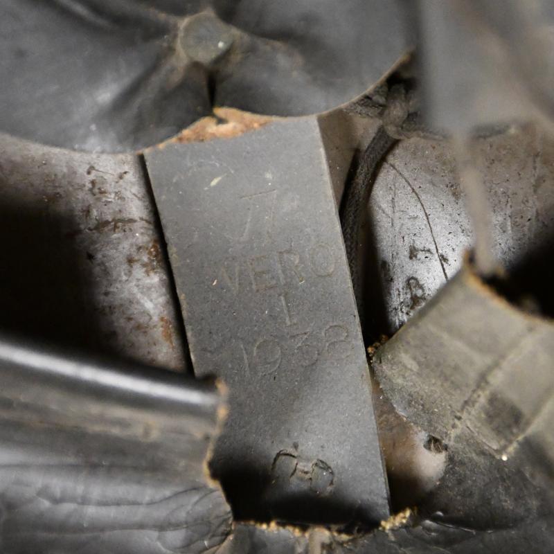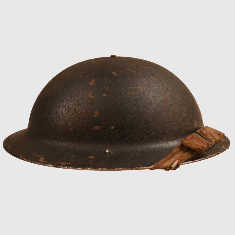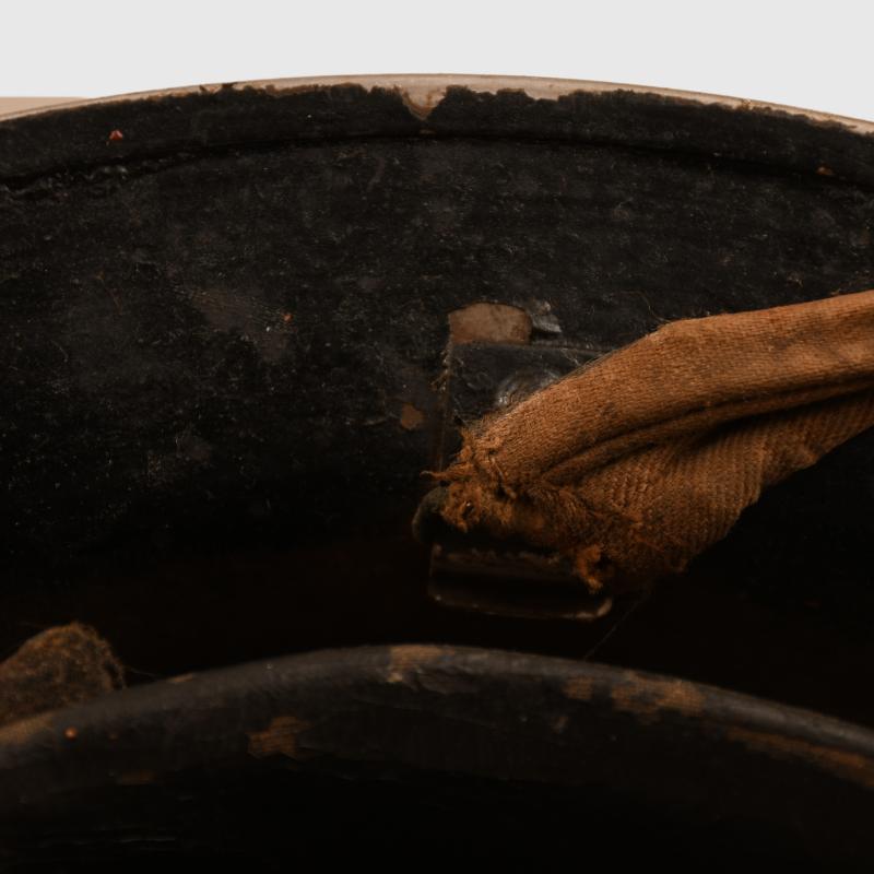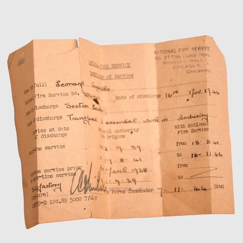 A 1939 dated liner Brodie helmet, painted black with a National Fire Service decal applied to the front, slightly different badge than we have normally encountered with a Union Flag to the centre. Slight losses to the paint, with its original elasticated webbing chinstrap. The liner is complete with its original drawstring. Tied to the chinstrap in a small plastic envelope is a National Fire Service certificate of service to a Leonard Carpenter with his National Fire Service number, date of discharge 16th June 1944, rank on discharge Section Leader. Wartime service from 2nd September 1939 with the local authority Fire Brigade and then with National Fire Service from the 18th August 41 to the 16.11.1944, with the signature of the Fire Force Commander.