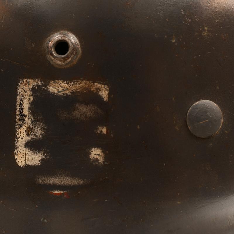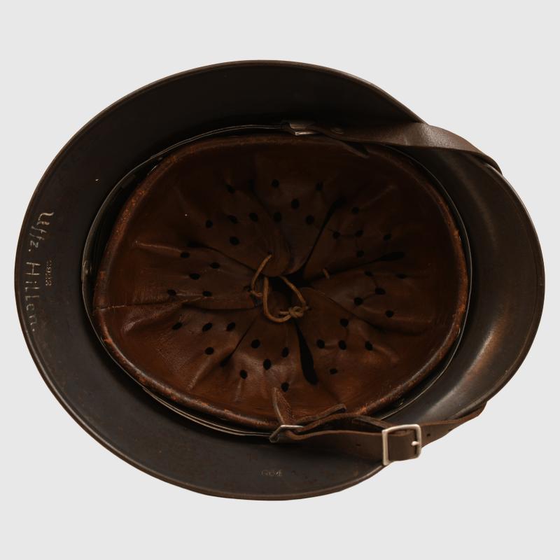 Lovely shell, stamped ‘Q64’ batch number ‘2922’ with original owner’s name of ‘Uffz.Hill’ hand applied in white paint to the inner rear skirt. The helmet retains all of its original Luftwaffe blue shiny finish. The Luftwaffe decal is good and clear with one abrasion across the top wing and slight thinness to the two lower arms of the swastika. The national tricolour has been rubbed away in accordance with the 1940 regulations but the white outer circumference is still visible. The interior liner in a nice good tan finish with its original drawstring. The chinstrap is of the correct period with the aluminium buckle and is maker marked.