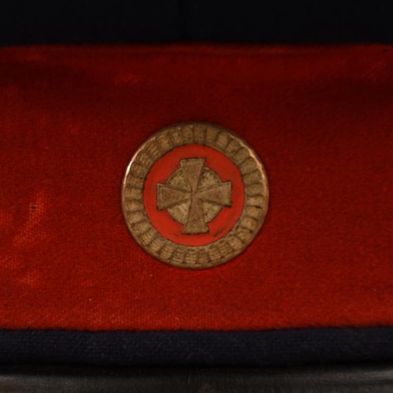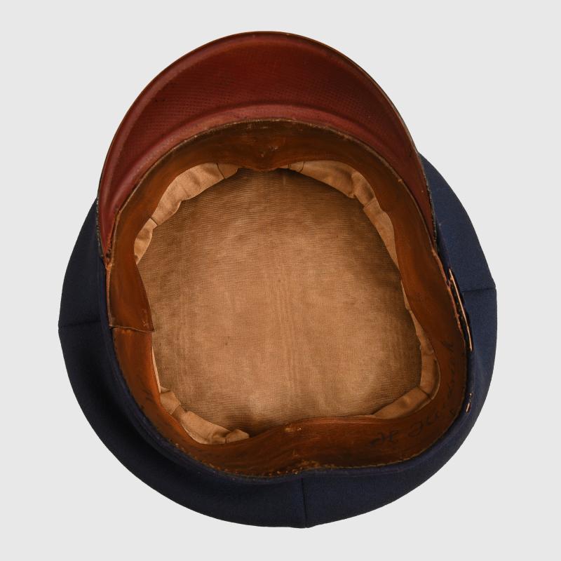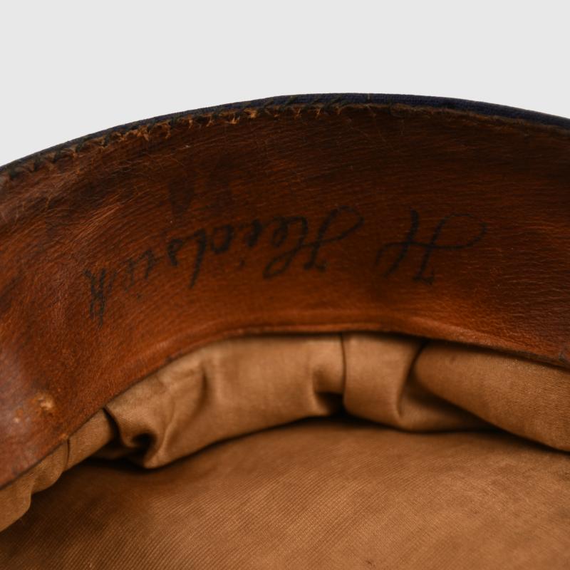 A large size standard blue Imperial German officers dress cap, having the rare roundel of the port of Bremen, worn only by reserve officers of Infantry Regiment 75 1st Hanseatisches, standard blue body with minor moth nips to the crown, minor moth tracking to the Red centre band, front peak crazed, original owner’s name hand applied to the leather sweatband which is all complete and undamaged, with standard service wear.